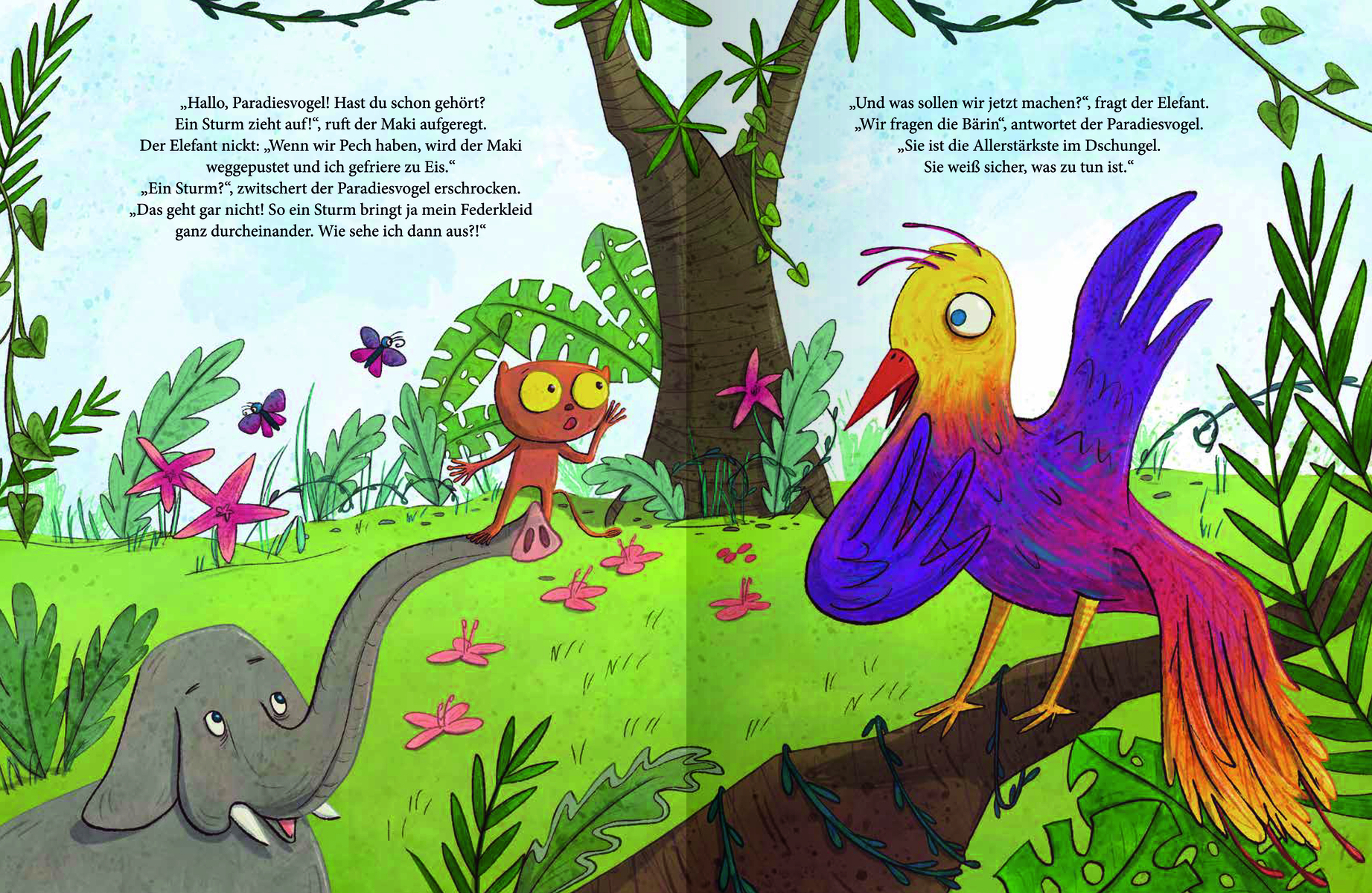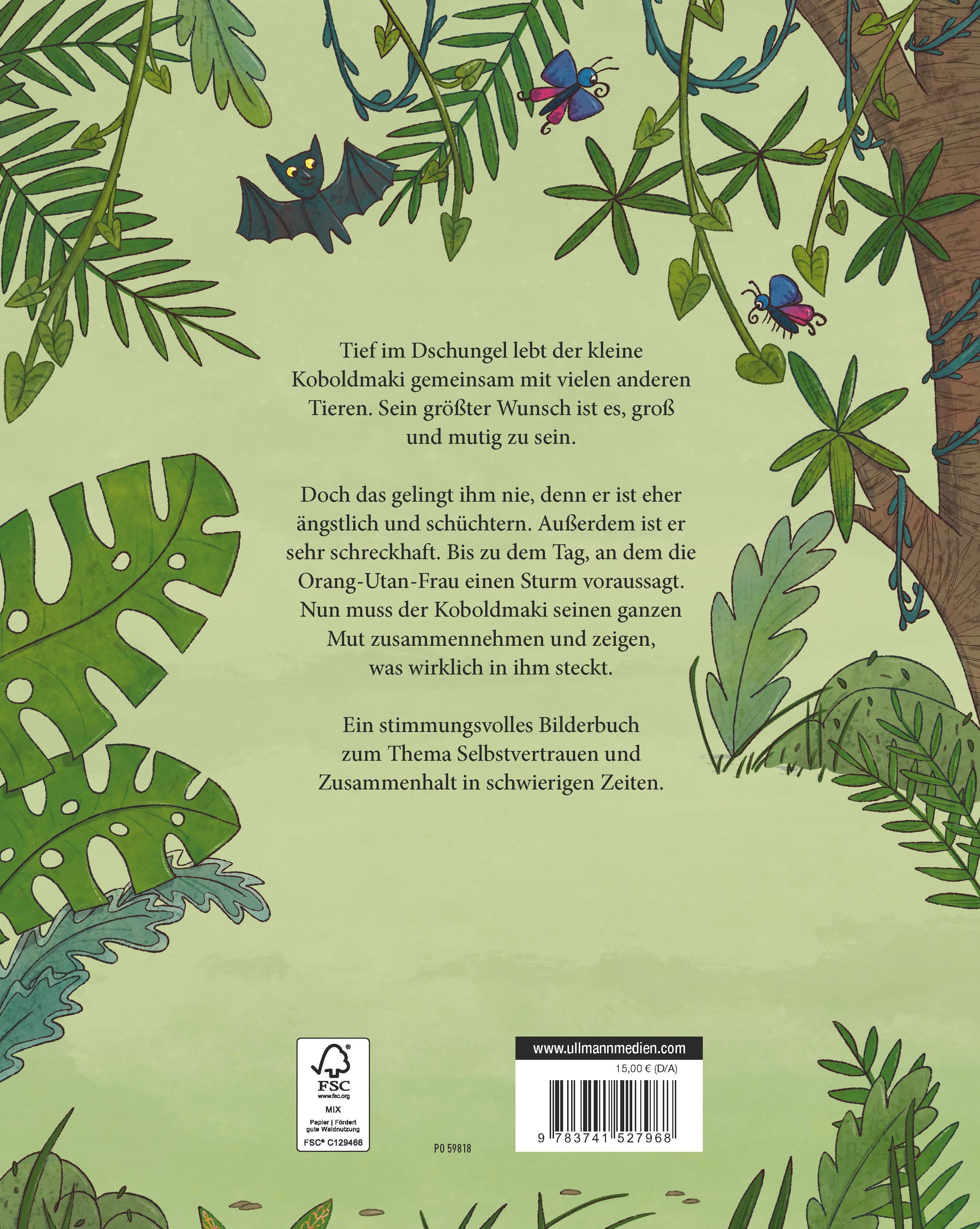 Der kleine Koboldmaki lebt gemeinsam mit vielen anderen Tieren im Dschungel. Sein größter Wunsch ist es, mutig und lässig zu sein, doch das gelingt ihm nie, denn er ist eher ängstlich und hadert damit, so klein zu sein. Außerdem ist er sehr schreckhaft. Bis zu dem Tag, an dem die Orang-Utan-Frau einen Sturm voraussagt. Nun muss der Koboldmaki seinen ganzen Mut zusammennehmen und zeigen, was wirklich in ihm steckt. Ein Bilderbuch zum Thema Selbstvertrauen und Zusammenhalt in schwierigen Zeiten. -Eigene Stärken erkennen-Angst überwinden-Mut und Selbstvertrauen stärken