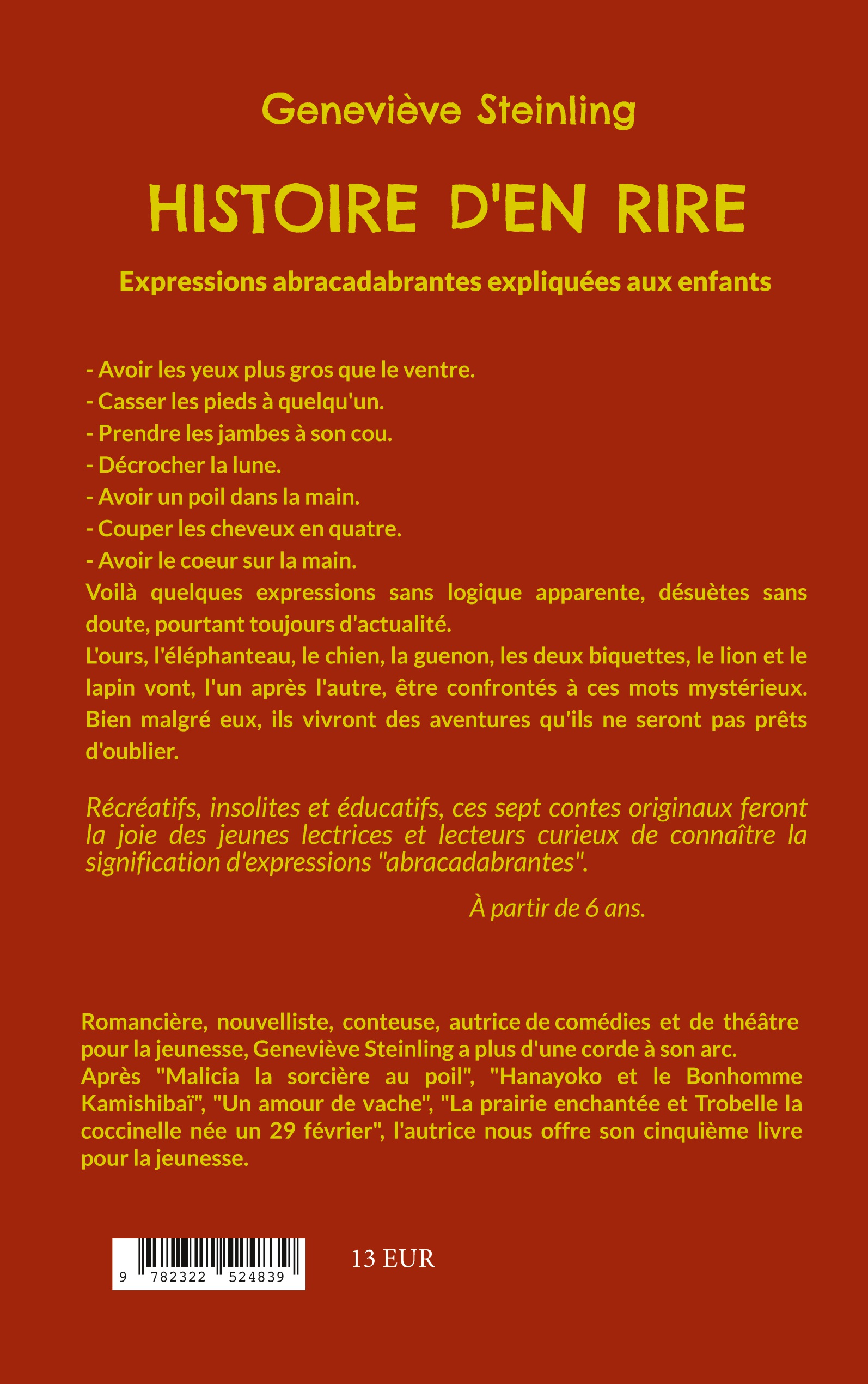 - Avoir les yeux plus gros que le ventre.- Casser les pieds à quelqu'un.- Prendre les jambes à son cou.- Décrocher la lune.- Avoir un poil dans la main.- Couper les cheveux en quatre.- Avoir le coeur sur la main. Voilà quelques expressions sans logique apparente, désuètes sans doute, pourtant toujours d'actualité.L'ours, l'éléphanteau, le chien, la guenon, les deux biquettes, le lion et le lapin vont, l'un après l'autre, être confrontés à ces mots mystérieux. Bien malgré eux, ils vivront des aventures qu'ils ne seront pas prêts d'oublier. Drôles, insolites et instructifs, ces sept contes originaux feront la joie des jeunes lectrices et lecteurs curieux de connaître la signification d'expressions "abracadabrantes". À partir de 6 ans.