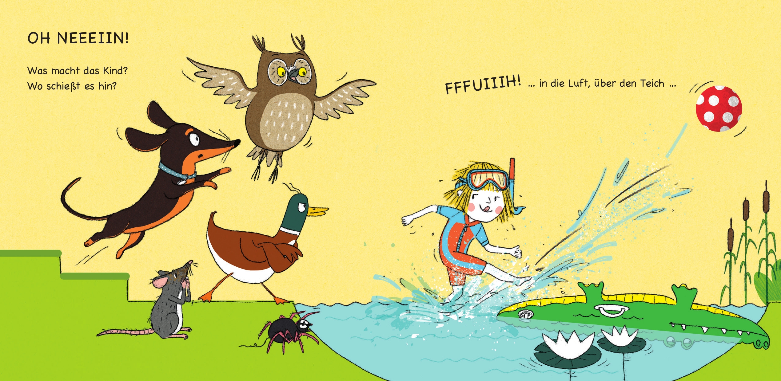 Ente spielt Ball. Hoppla - was macht der Ball, wo fliegt er hin? Die Ente jagt dem Ball hinterher und auf jeder Doppelseite kommt ein Tier dazu, bis eine ganze Menagerie durchs Bilderbuch flitzt. Haltet den Ball! Der springt - BAMM! - an den Baum, hüpft - DOING, DOING, DOING - die Treppen hinunter, landet - PLATSCH - im Teich, bevor das Kind ihn - FFFUIIIH! - ins Tor schießt und das Spiel endlich losgehen kann. Susanne Straßers wilde Jagd nach dem Ball macht nicht nur Kinder hellwach, sie animiert auch die Großen. Erst zum Vorlesen, dann zum Kicken.- Klare Bildsprache, stabile Seiten: ein Bilderbuch mit Tieren für Kinder ab 2 Jahren- Das Pappbilderbuch zum Vorlesen, Betrachten, Anfassen - und Nachspielen!- Sprachförderung für Kleinkinder mit einer lustigen Tiergeschichte- Ball spielen mit vollem Einsatz: Wo der Kinderball wohl als nächstes landet?- Wenn Ente und Eule gemeinsam auf Jagd sind: Kettengeschichte mit Augenzwinkern- Bilderbücher für Krippenkinder: erste Ausflüge in die Welt der Geschichten- Ein gewitzter Vorlesespaß für Groß und Klein mit vergnüglichen LautmalereienDie farbenfrohen Illustrationen laden zu immer neuen Entdeckungen ein, die stabilen Seiten des Bilderbuchs halten auch den neugierigsten Händen stand - perfekt für den Einsatz in Krippe, Kita und Kinderzimmer!