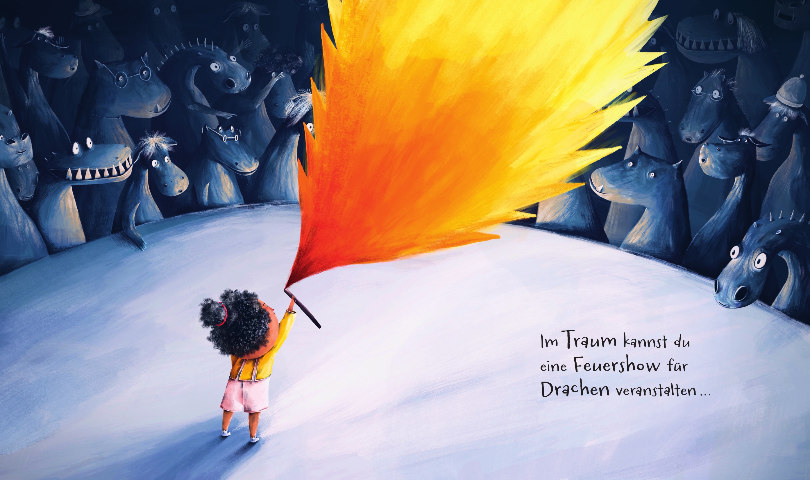 Von Träumen, die fantastische Welten eröffnen, erzählt dieses Buch in einfachen Worten und zusammen mit den großen, farbsatten Bildern der jungen Illustratorin Natascha Baumgärtner hebt Adrian Draschoff die Gesetze der Schwerkraft auf und macht das Unmögliche möglich. Vielleicht springst du mit dem Trampolin ins Weltall? Oder buddelst einen Tunnel zum Mittelpunkt der Erde? Vielleicht spazierst du kopfüber an der Zimmerdecke, oder schwimmst mit einer Meerjungfrau im Ozean... Ein Einschlafbuch, das die Nacht mit bunten Bildern füllt. Bilder, in der die Meerjungfrau eine beeindruckend große, starke Schwimmerin ist, keine zierliche Arielle. Auch das bedeutet bunt!