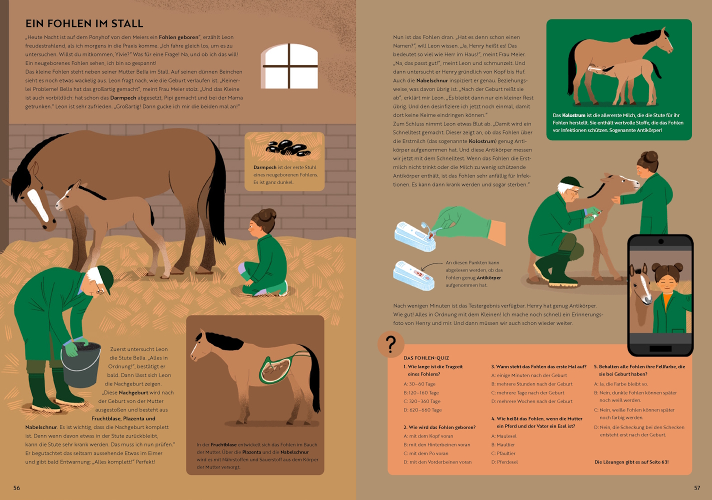 Neben dem Einblick in den Praxisalltag erhalten die Leser:innen in diesem Buch auch jede Menge Informationen über die Tiere selbst: was die Knochen für eine Funktion haben, wie unterschiedlich die Skelette aussehen, wie Gelenke aufgebaut sind, wie Zähne gesund bleiben, wie die Verdauung abläuft, wie das Herz-Kreislauf- und das Nervensystem funktionieren, welche Organe daran beteiligt sind und was für Unterschiede es hier bei den verschiedenen Tieren gibt. Zudem erfahren die Kinder, was passiert, wenn die Organe nicht richtig funktionieren und es zu Krankheiten kommt.