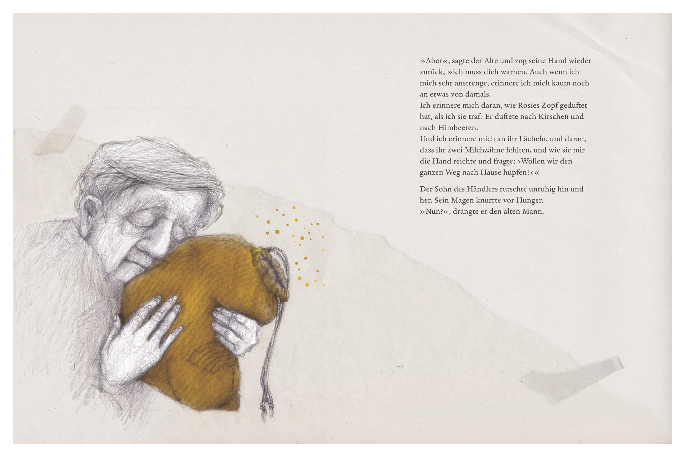 »Vielleicht«, sagte der Alte, »schaut von einem dieser Sterne auch meine große Liebe herab und erinnert sich an mich.« Wie lieb und teuer ihm die Erinnerung an seine Rosie ist, merkt der alte Mann erst, als er sie hergegeben hat. Doch zum Glück kann er sie zurücktauschen. Der Duft von Kirschen und Himbeeren, Rosies Kleidung und das Lächeln: Plötzlich sieht er alles viel deutlicher vor sich als jemals zuvor ...