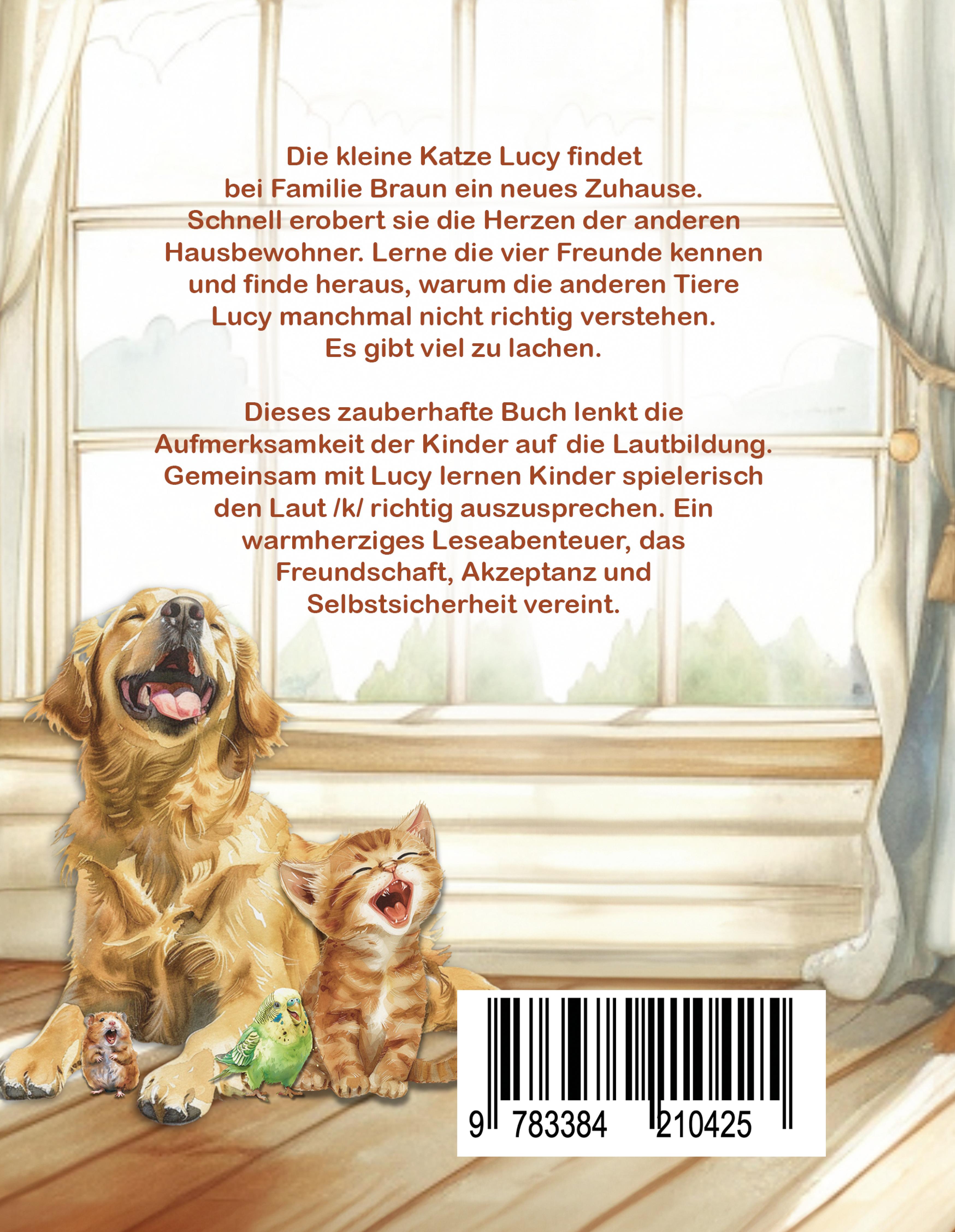 Eine lustige Geschichte mit bunten Illustrationen zur SprachförderungDie kleine Katze Lucy findet bei Familie Braun ein neues Zuhause. Schnell erobert sie die Herzen der anderen Hausbewohner. Lerne die vier Freunde kennen und finde heraus, warum die anderen Tiere Lucy manchmal nicht richtig verstehen. Es gibt viel zu lachen. Dieses zauberhafte Buch lenkt die Aufmerksamkeit der Kinder auf die Lautbildung. Gemeinsam mit Lucy lernen Kinder spielerisch den Laut /k/ richtig auszusprechen. Ein warmherziges Leseabenteuer, das Freundschaft, Akzeptanz und Selbstsicherheit vereint.