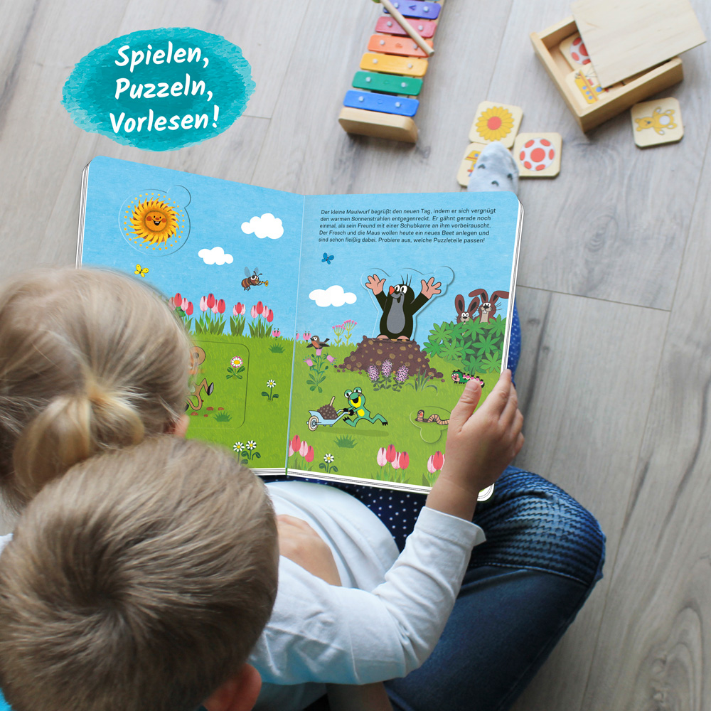 Dieses Puzzlebuch mit dem kleinen Maulwurf uns seinen Freunden lädt zum Staunen, Entdecken und Vorlesen ein! Die Puzzleteile in unterschiedlichen Größen fügen sich perfekt in die liebevoll illustrierte Geschichte ein und lassen sich nach dem Spielen im Aufbewahrungsfach verstauen und transportieren. Ein Puzzlespaß, der nicht nur die Feinmotorik fördert, sondern durch die kleinen Suchspiele die Konzentration und Fantasie anregt.