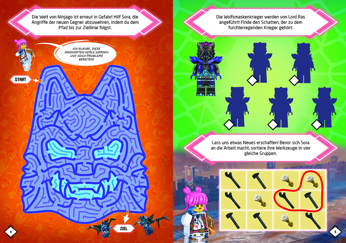 In diesem Rätselheft begleiten Leser und Leserinnen Sora, die mit Arin in der neuen Welt der vereinten Reiche von Ninjago Prüfungen bestehen muss. Nachdem sie entdeckt, dass sie bei allem, was mit Technik zu tun hat, ganz in ihrem Element ist, stellt sie sich den neuen Herausforderungen selbstbewusst und stark. Mit dem enthaltenen Miniset „Sora mit Werkzeugen“ können Geschichten nachgespielt werden. Neben einer aufregenden Geschichte und lustigen Comics, die dem typischen LEGO-Humor treu bleiben, können außerdem wieder zahlreiche Rätsel gelöst werden.