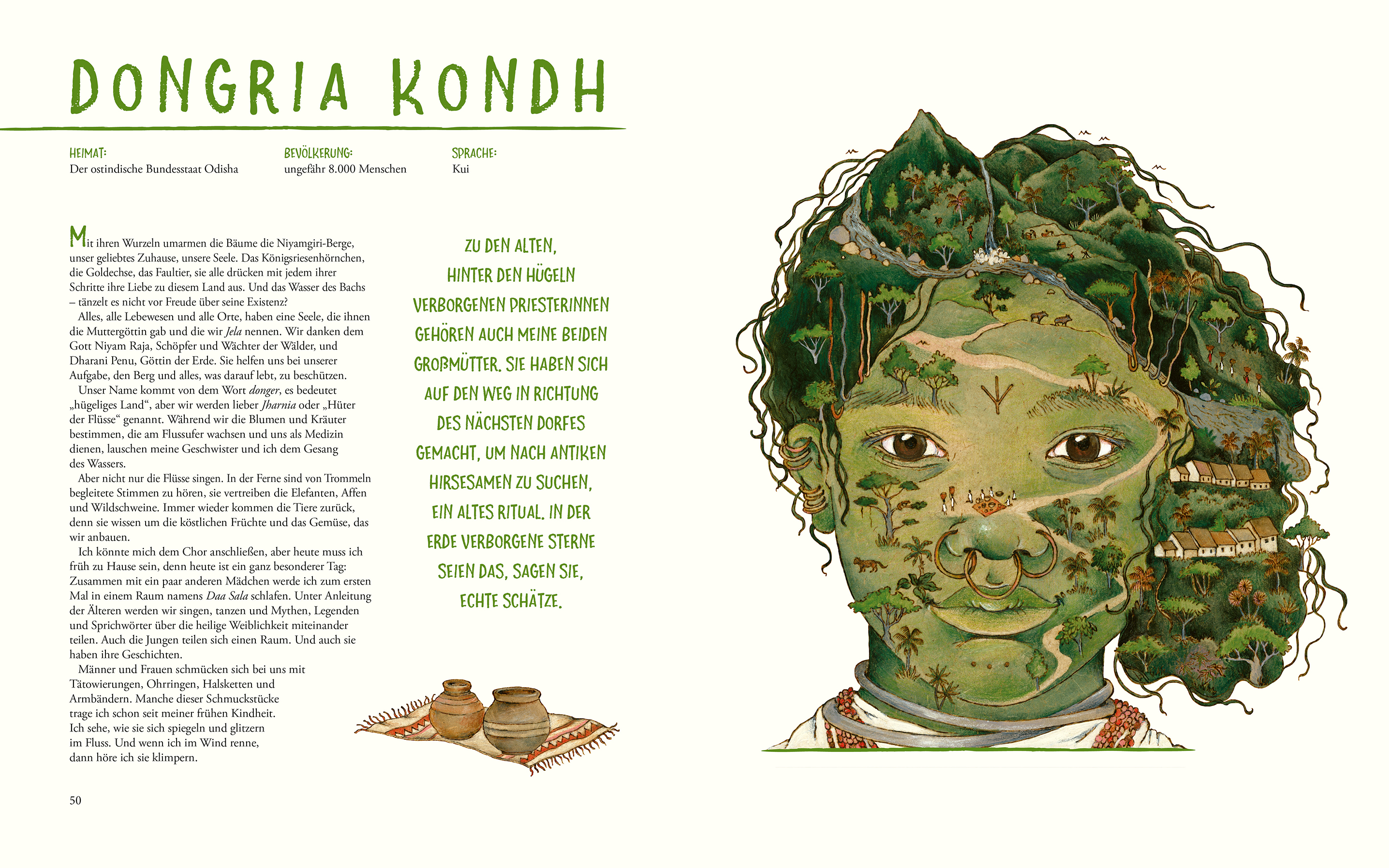 Jede Doppelseite bietet einen malerischen Blick auf eines von mehr als zwanzig indigenen Völkern, die Gebiete bewohnen und die Herausforderungen, denen sie sich dort stellen. In all diesen Verbünden ist vor allem das Leben in einer Gemeinschaft vorherrschend, das auf Anerkennung, Solidarität und gegenseitiger Hilfe basiert, Überfluss vermeidet und das Erbe der Natur würdigt. Sie schützen die natürliche Umwelt in der sie leben.