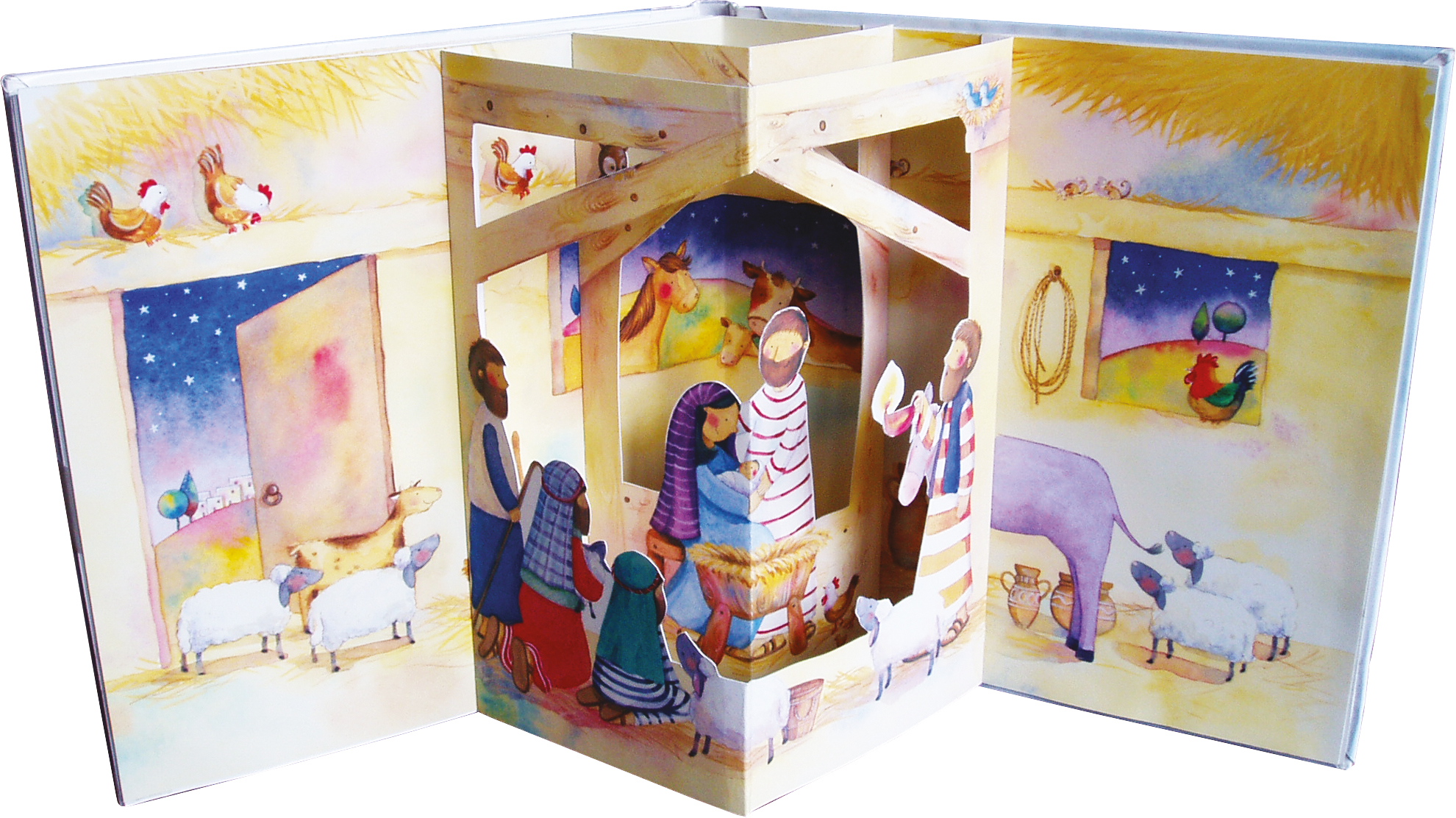 Ein Engel kommt zu Maria, und verkündet ihr: „Du wirst ein Kind bekommen, den Sohn Gottes.“ Mit dieser Botschaft beginnt die Weihnachtsgeschichte, die Sally Ann Wright einfühlsam für Kinder nacherzählt. Von den farbenfrohen Illustrationen eindrucksvoll in Szene gesetzt, begleiten Kinder Maria und Josef auf Herbergssuche, hören mit den Hirten das Lob der Engel und besuchen mit den Heiligen Drei Königen das Kind in der Krippe. Dabei verkürzen 24 Adventskalendertürchen, hinter denen sich kleine Bilder verstecken, die Wartezeit auf das Weihnachtsfest. Das größte Highlight wartet am Ende des Buches auf kleine Entdecker: Beim Aufklappen der letzten Seite entsteht eine große Pop-up-Krippenszene, die aufgestellt zum beeindruckenden Blickfang im Kinderzimmer wird.