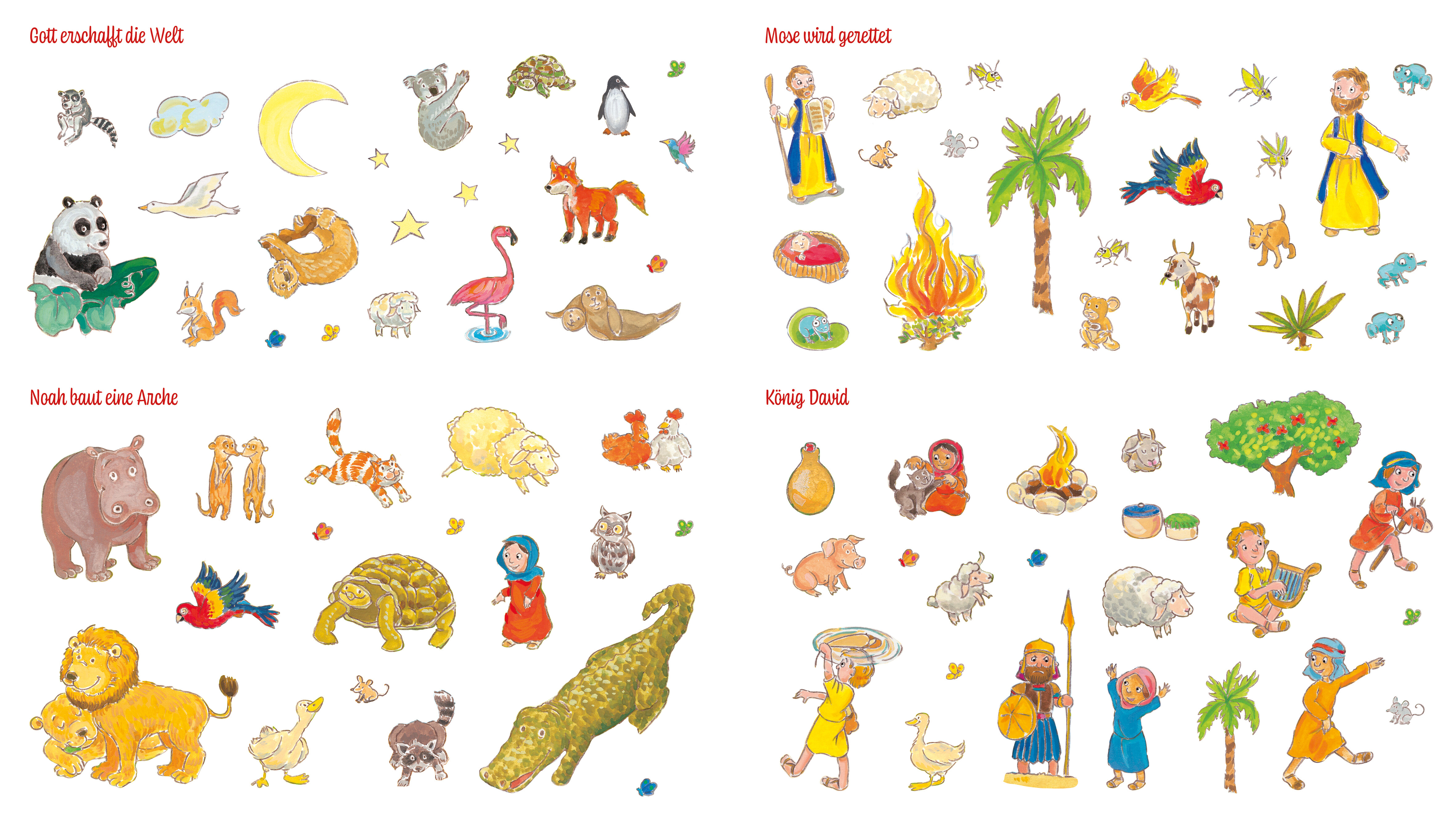 So machen die beliebten Geschichten rund um Noah, Mose, David, Jona und Jesus schon den Kleinsten Freude. Mit über 270 wiederablösbaren Stickern können die detailreichen Wimmelbilder immer wieder neu fantasievoll gestaltet werden. Kurze knifflige Rätsel sorgen dabei für Abwechslung. Eine tolle Beschäftigung für zuhause oder unterwegs!