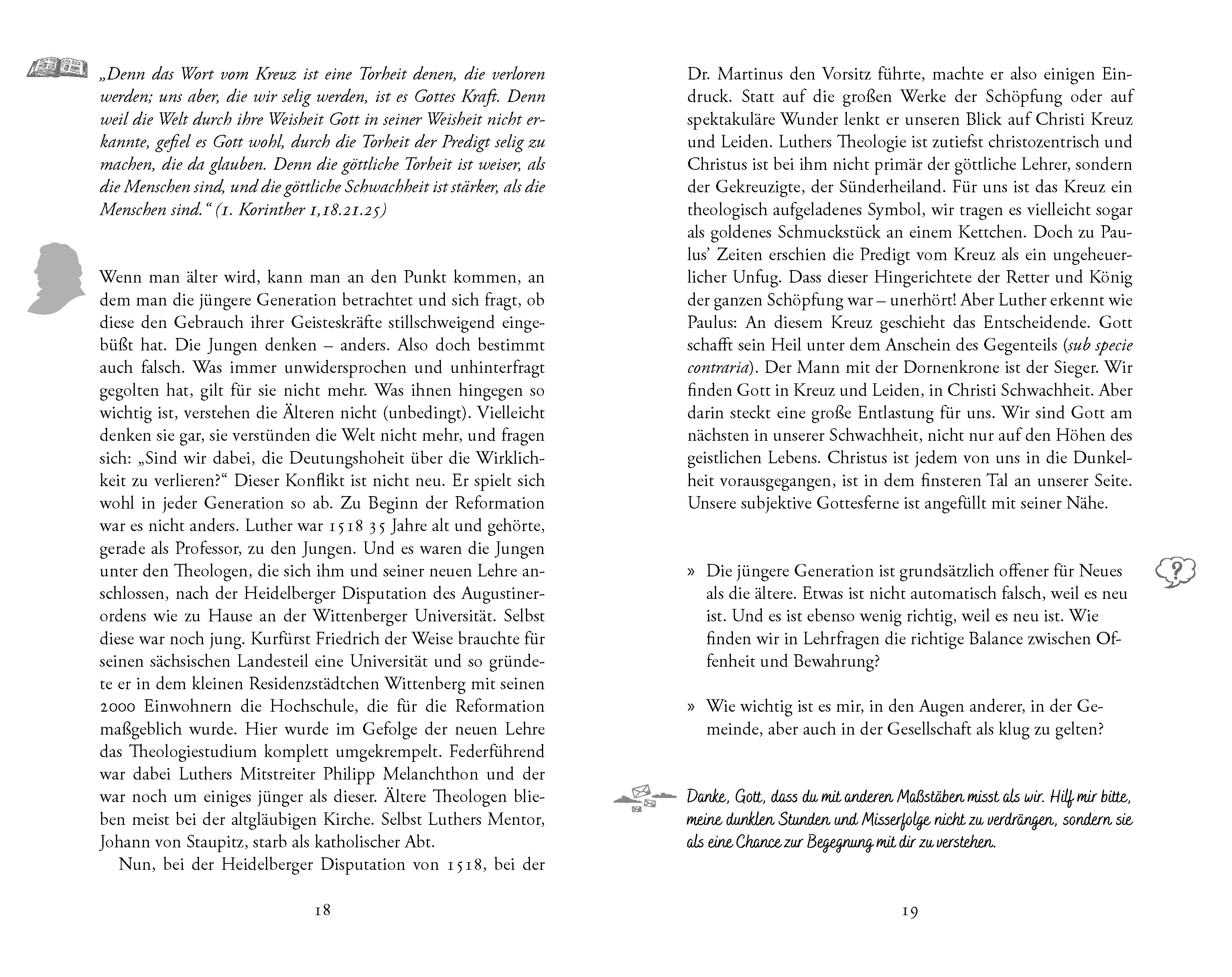 Lassen Sie sich von Luther inspirieren und entdecken Sie, was er uns heute noch für unseren Glauben und unsere Spiritualität zu sagen hat. Anregungen zum Weiterdenken helfen, die Gedanken Luthers ins eigene Leben zu bringen.