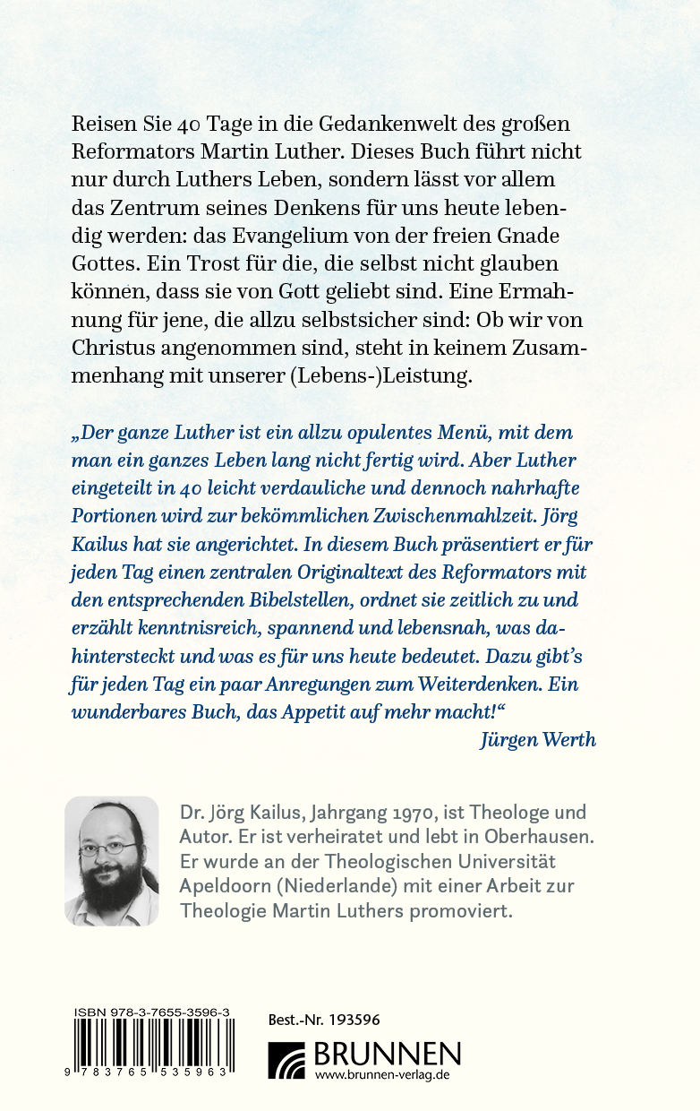 Mit diesem Andachtsbuch des promovierten Theologen Jörg Kalius begeben Sie sich auf eine 40-tägige Reise in die Gedankenwelt des großen Reformators Martin Luther: Ausgewählte Texte aus Luthers Werken - die Ablassthesen, die Tischreden, "Von der Freiheit eines Christenmenschen", Invokavit-Predigten und viele mehr - lassen ihn selbst zu Wort kommen.