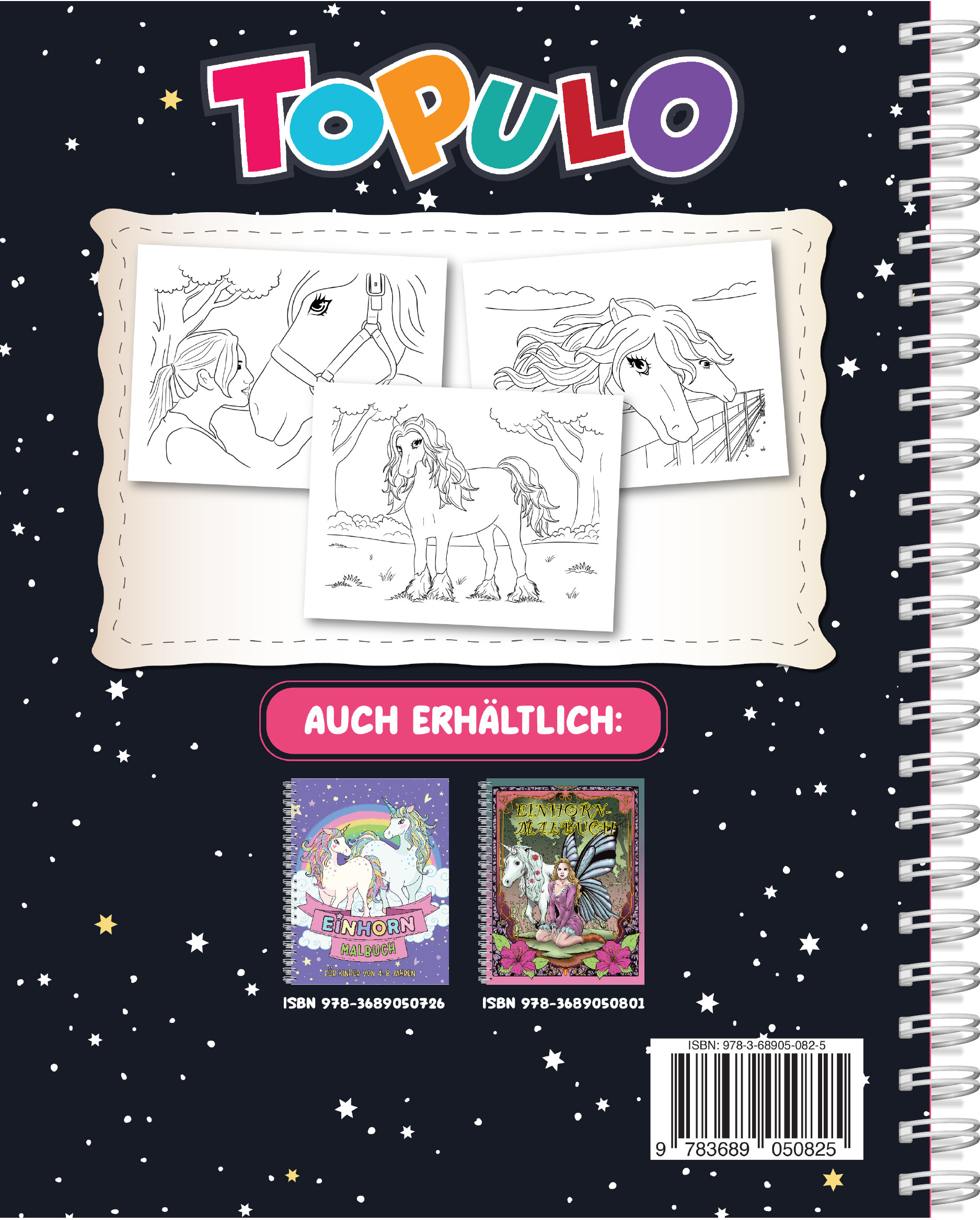 In diesem Malbuch erwarten euch über 40 liebevoll gestaltete Pferde-Malvorlagen. Die Motive zeigen Pferde in unterschiedlichen Situationen und sorgen für abwechslungsreichen Malspaß. Durch den einseitigen Druck werden Farben nicht durchgedrückt, und dank der Ringheftung lassen sich die Seiten bequem herauslösen. Das Ausmalen unterstützt Kinder dabei, ihre Kreativität, Konzentration und Feinmotorik zu stärken und gleichzeitig zur Ruhe zu kommen. Ein ideales Malbuch für alle, die Pferde lieben und gerne zeichnen und ausmalen.