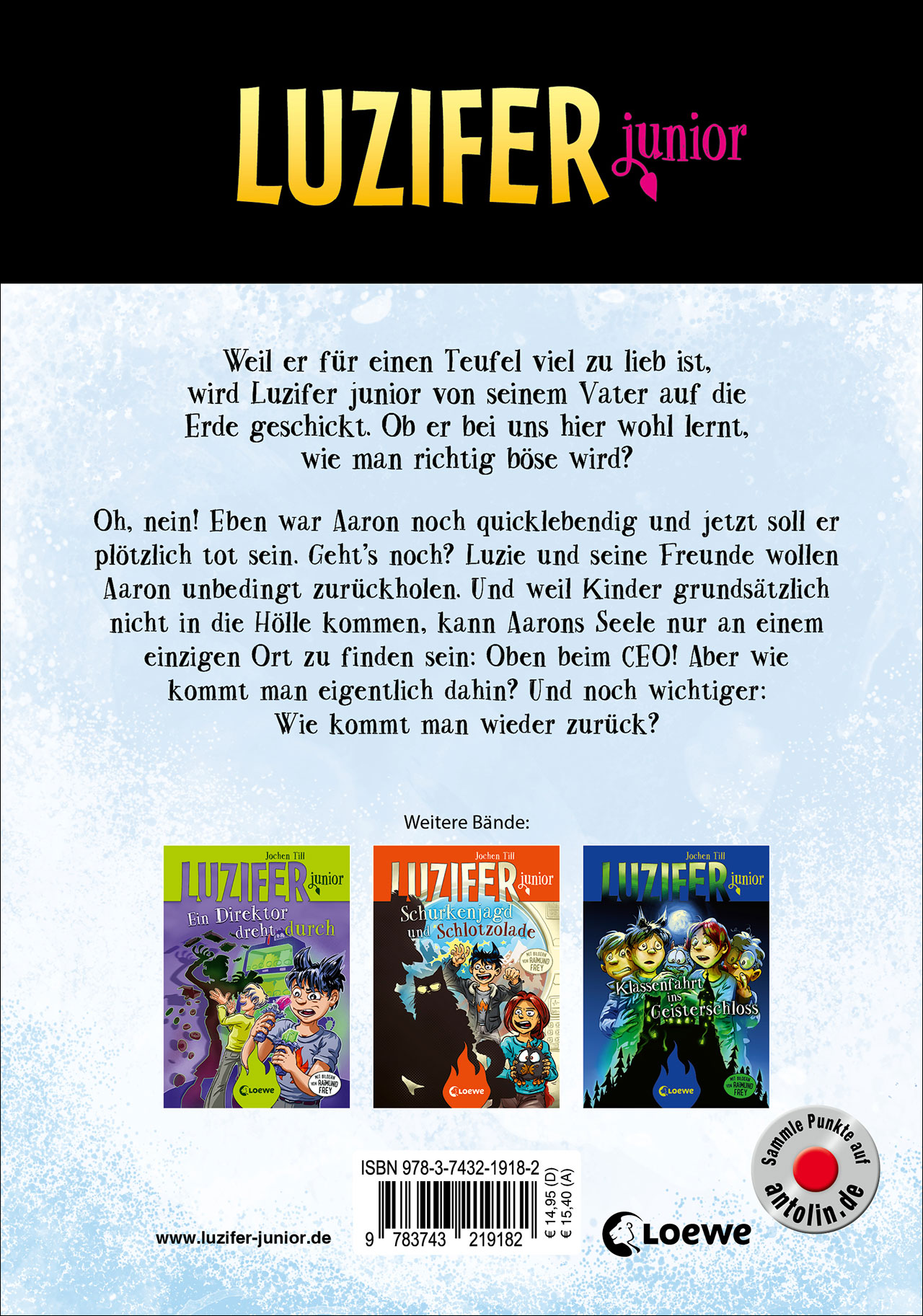Weil er für einen Teufel viel zu lieb ist, wird Luzifer junior von seinem Papa auf die Erde geschickt. Ob er bei uns hier wohl lernt, wie man richtig böse wird? Oh, nein! Eben war Aaron noch quicklebendig und jetzt soll er plötzlich tot sein. Geht's noch? Luzie und seine Freunde wollen Aaron unbedingt zurückholen. Und weil Kinder unter vierzehn Jahren grundsätzlich nicht in die Hölle kommen, kann Aarons Seele nur an einem einzigen Ort zu finden sein: Oben beim CEO! Aber wie kommt man dahin und wieder zurück, ohne selbst zu sterben? Für ängstliche Gemüter sei so viel verraten: Jochen Till bringt seine vier Helden plus Cornibus auch nach diesem Abenteuer selbstverständlich wieder heil und gesund nach Hause.