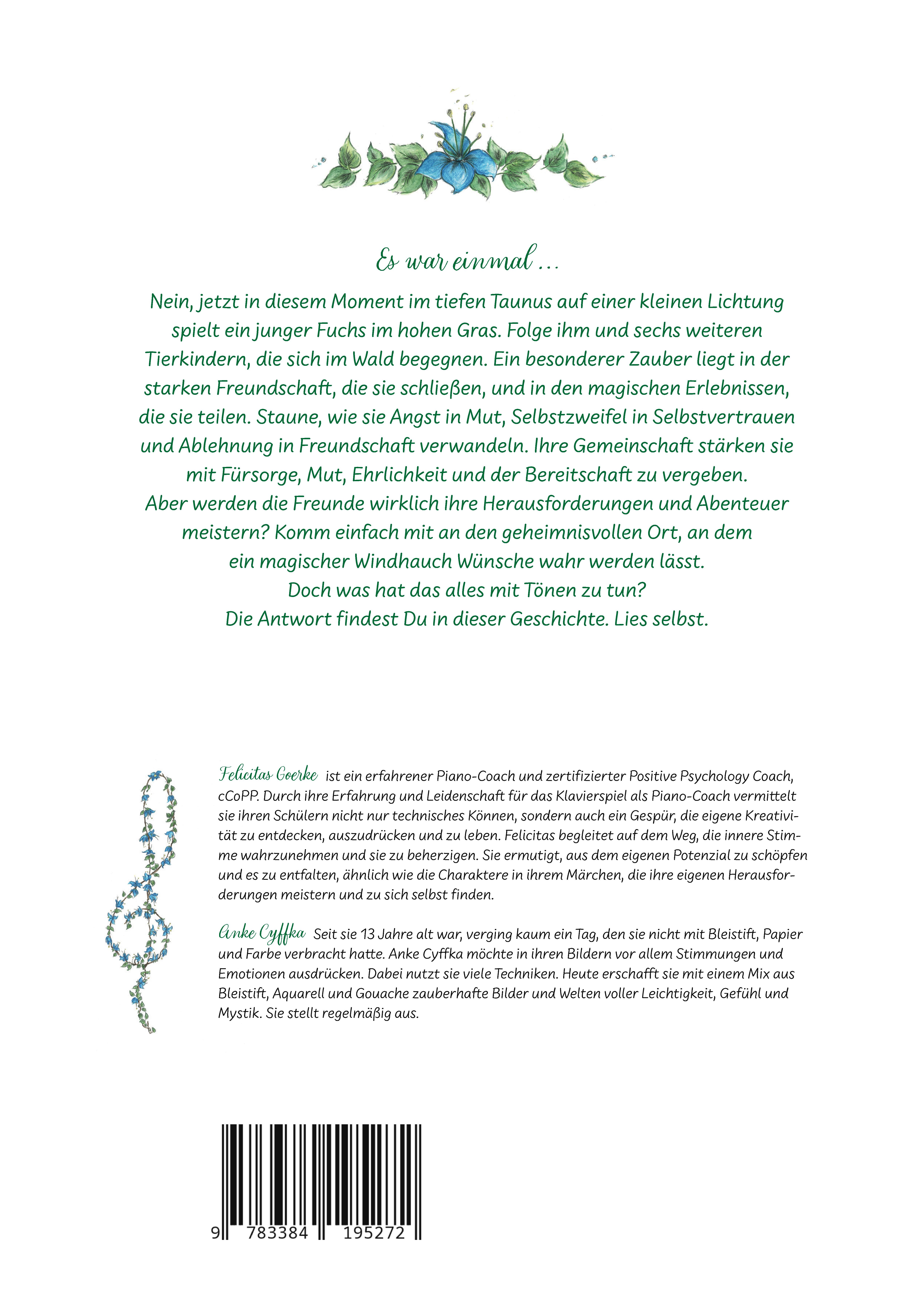 Es war einmal ...Nein, jetzt in diesem Moment im tiefen Taunus auf einer kleinen Lichtung spielt ein junger Fuchs im hohen Gras. Folge ihm und sechs weiteren Tierkindern, die sich im Wald begegnen. Ein besonderer Zauber liegt in der starken Freundschaft, die sie schließen, und in den magischen Erlebnissen, die sie teilen. Staune, wie sie Angst in Mut, Selbstzweifel in Selbstvertrauen und Ablehnung in Freundschaft verwandeln. Ihre Gemeinschaft stärken sie mit Fürsorge, Mut, Ehrlichkeit und der Bereitschaft zu vergeben. Aber werden die Freunde wirklich ihre Herausforderungen und Abenteuer meistern? Komm einfach mit an den geheimnisvollen Ort, an dem ein magischer Windhauch Wünsche wahr werden lässt. Doch was hat das alles mit Tönen zu tun? Die Antwort findest Du in dieser Geschichte. Lies selbst. - Möge diese Geschichte ein Lächeln auf Dein Gesicht zaubern und Dich dazu inspirieren, Freude, Staunen, Mut, Hoffnung, Intuition und ein wenig Humor in Dein Leben einzuladen. Und vielleicht wird in Dir die Sehnsucht wach, selbst Musik zu machen.