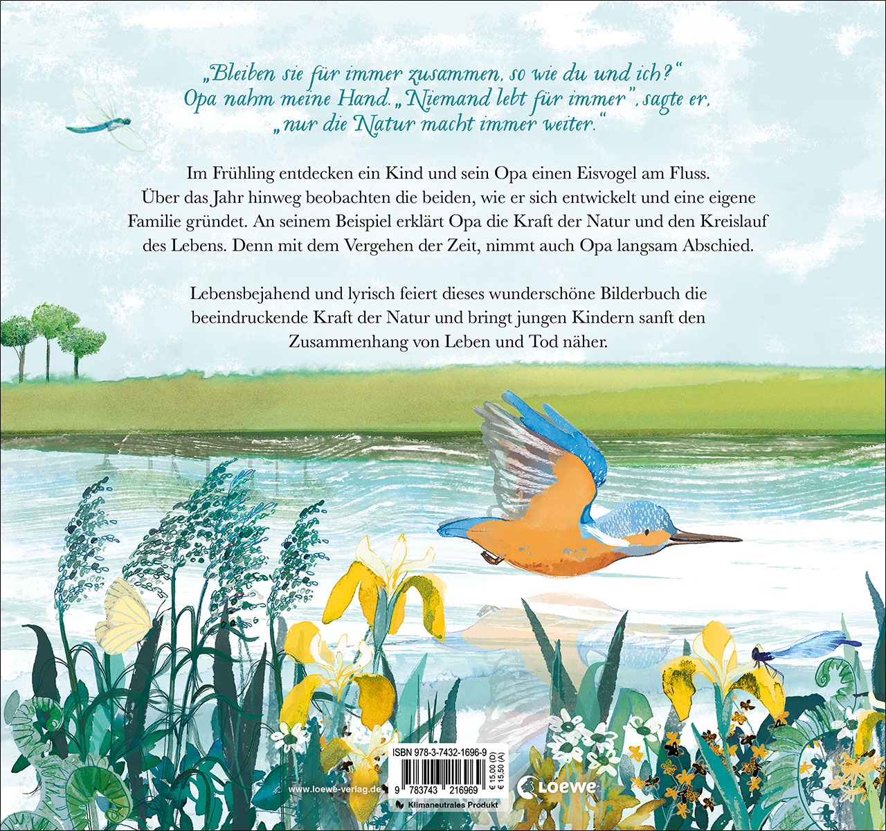 Im Frühling entdecken ein Junge und sein Opa einen Eisvogel am Fluss. Über das Jahr hinweg beobachten die beiden, wie er sich entwickelt und eine eigene Familie gründet. An seinem Beispiel erklärt Opa seinem Enkel die Kraft der Natur und den Kreislauf des Lebens. Denn mit dem Vergehen der Zeit, nimmt auch Opa langsam Abschied.