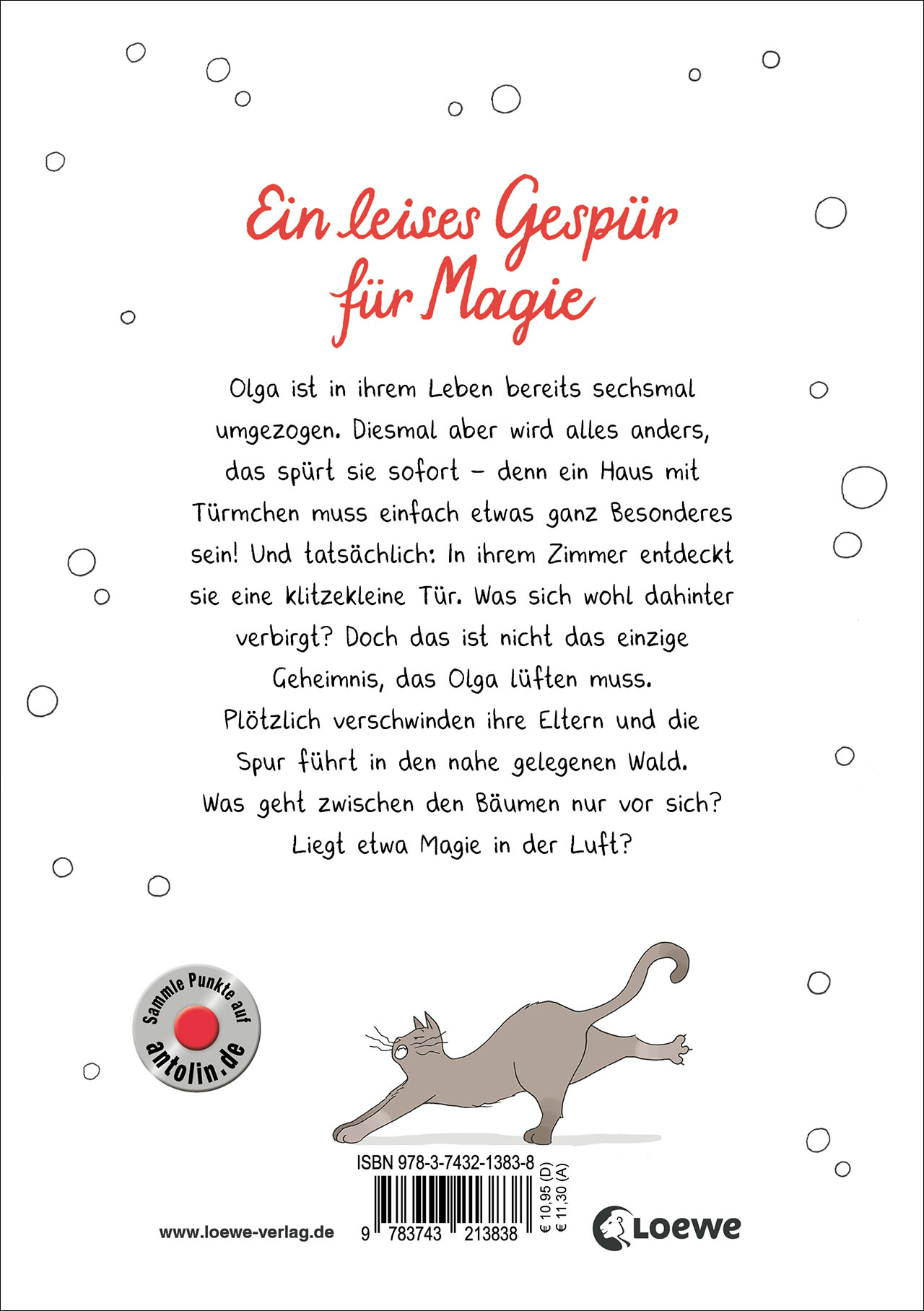 Olga ist in ihrem Leben bereits sechsmal umgezogen. Diesmal aber wird alles anders, das spürt sie sofort - denn ein Haus mit Türmchen muss einfach etwas ganz Besonderes sein! Und tatsächlich: In ihrem Zimmer entdeckt sie eine klitzekleine Tür. Was sich wohl dahinter verbirgt? Doch das ist nicht das einzige Geheimnis, das Olga lüften muss. Plötzlich verschwinden ihre Eltern und die Spur führt in den nahe gelegenen Wald. Was geht zwischen den Bäumen nur vor sich? Liegt etwa Magie in der Luft?