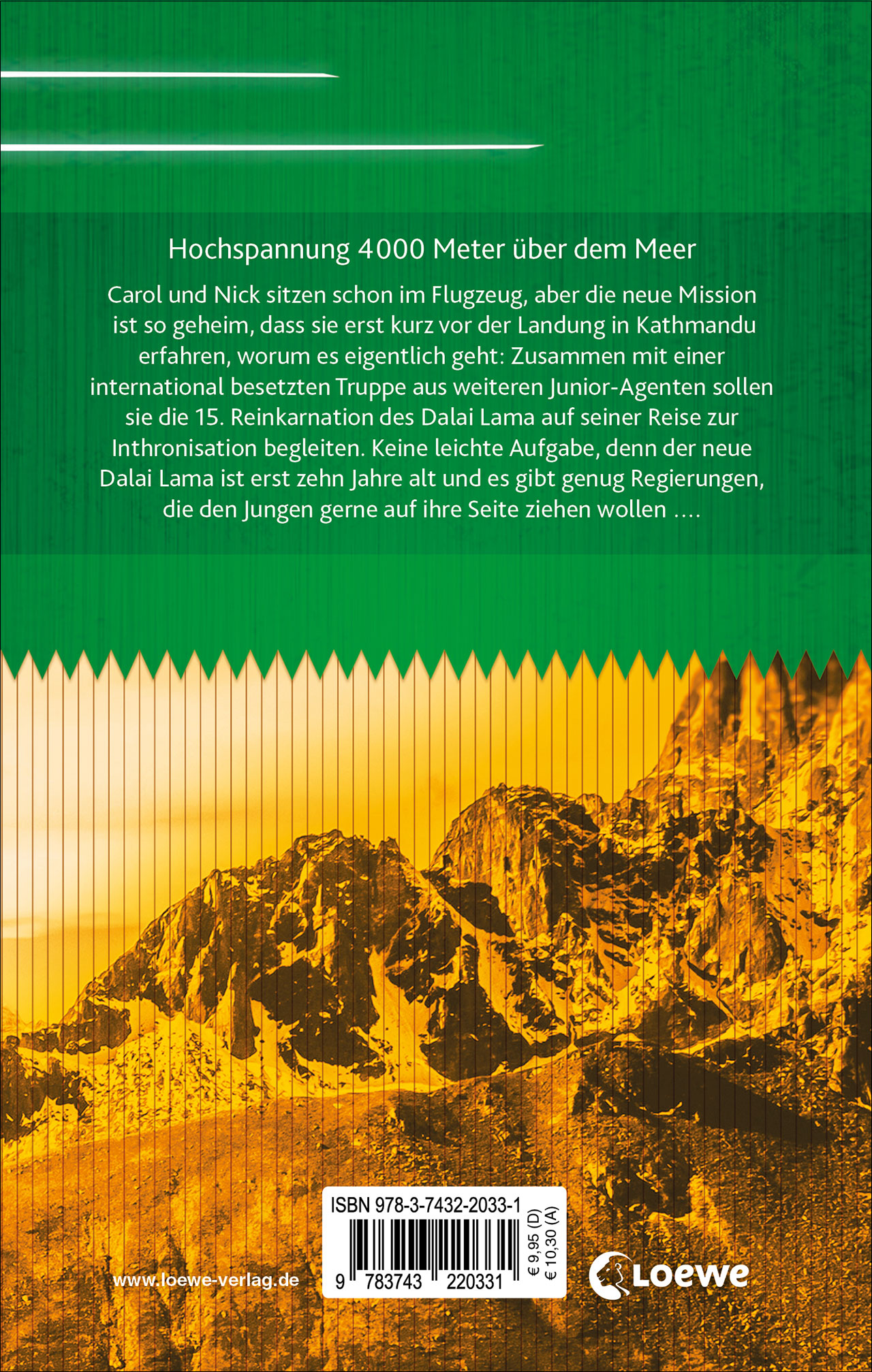 Agentenabenteuer der Extraklasse Carol und Nick sitzen schon im Flugzeug, aber die neue Mission ist so geheim, dass sie erst kurz vor der Landung in Kathmandu erfahren, worum es eigentlich geht: Zusammen mit einer international besetzten Truppe aus weiteren Junior-Agenten sollen sie die 15. Reinkarnation des Dalai Lama auf seiner Reise zur Inthronisation begleiten. Keine leichte Aufgabe, denn der neue Dalai Lama ist erst zehn Jahre alt, und es gibt genug Regierungen, die den Jungen gerne auf ihre Seite ziehen wollen.