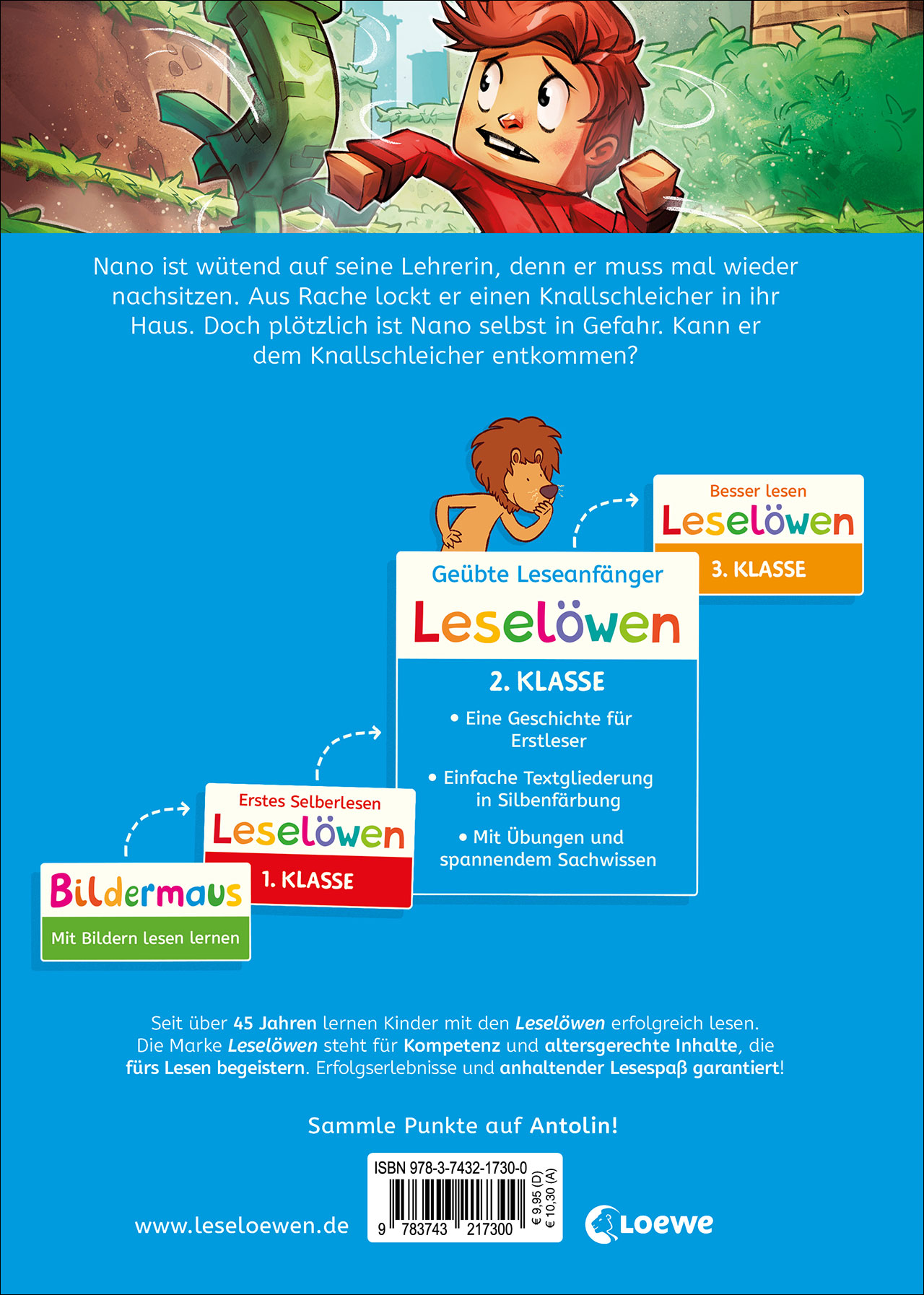 Die Leselöwen für die 2. Klasse machen Kinder zu Leseprofis: Beliebte Themen und Character sorgen für Spannung und Spaß. Dank eines ausgewogenen Text-Bild-Verhältnisses und großer Schrift, die extra für Leseanfänger*innen entwickelt wurde, können Kinder ab 7 Jahren den Inhalt spielend leicht erfassen. Die Silbenfärbung unterstützt beim Erkennen einzelner Wörter. Begleitende Informationen und Erklärungen vertiefen darüber hinaus das Allgemeinwissen. Anhand der Fragen am Ende jedes Kapitels können die Kinder zudem überprüfen, ob sie den Text richtig verstanden haben. Nano ist wütend auf seine Lehrerin, er muss mal wieder nachsitzen. Aus Rache lockt er einen Knallschleicher in ihr Haus. Doch plötzlich ist Nano selbst in Gefahr. Kann er dem Knallschleicher entkommen?