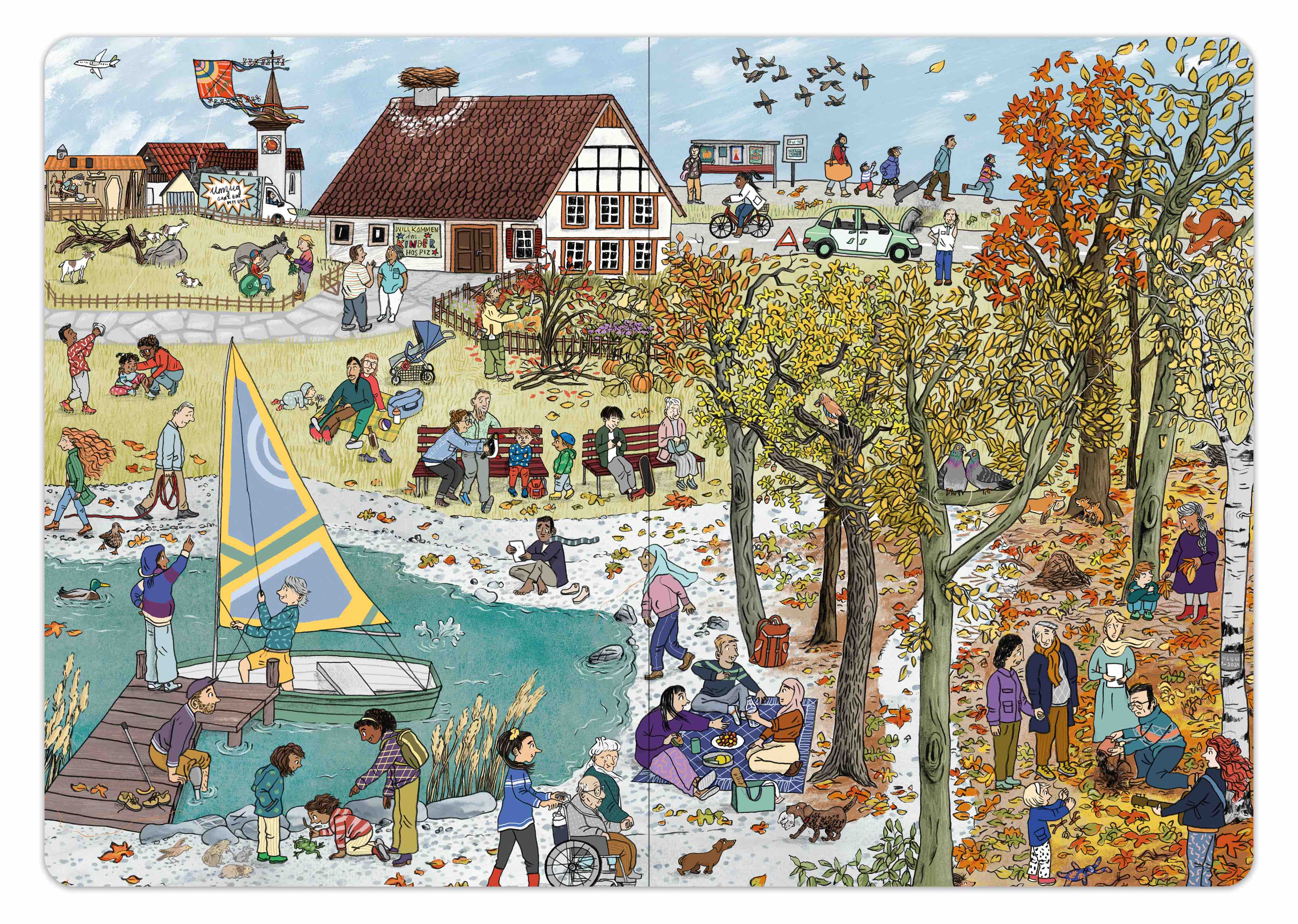 Das Wimmelbuch vom Abschiednehmen thematisiert die Gleichzeitigkeit von Leben und Leid und begleitet ganz unterschiedliche Menschen, die einen Abschied verkraften müssen, über ein Jahr hinweg:
