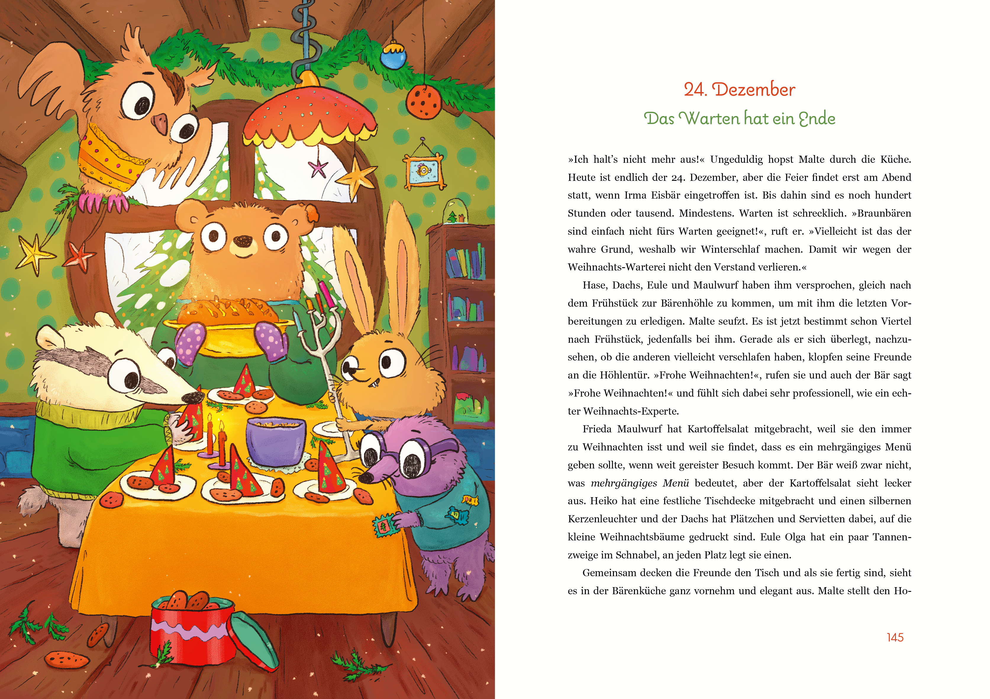 Braunbär Malte will es sich gerade für den Winterschlaf gemütlich machen, als ihn eine Handynachricht aufschreckt: Seine Freundin, Eisbärin Irma, will ihn besuchen, um mit ihm Weihnachten zu feiern. Und sie ist sogar schon unterwegs! Dabei hat Malte doch gar keine Ahnung, wie man Weihnachten feiert. Schließlich schläft er ja sonst zu dieser Zeit. Aber an Schlaf ist jetzt nicht mehr zu denken - er braucht Weihnachtshilfe! Seine Freunde Heiko Hase, Emil Dachs, Frieda Maulwurf und Olga Eule sind sofort zur Stelle und zeigen ihm, wie man Plätzchen backt, Baumschmuck bastelt, Geschenke verpackt oder Schneebären baut. Malte ist begeistert bei der Sache, auch wenn er so manchen Brauch missversteht und ihm beim Basteln immer wieder seine großen Tatzen in die Quere kommen. Und dann muss er auch noch dahinterkommen, welche Überraschung er Irma versprochen hat. Leider kann er sich nicht daran erinnern, was er aber nicht zugeben mag. Doch dank Irmas Hinweisen in jedem Kapitel kommt er der Sache langsam auf die Spur. Ob er es bis zum 24. Dezember schafft, das Rätsel zu lösen und Irma zu überraschen?