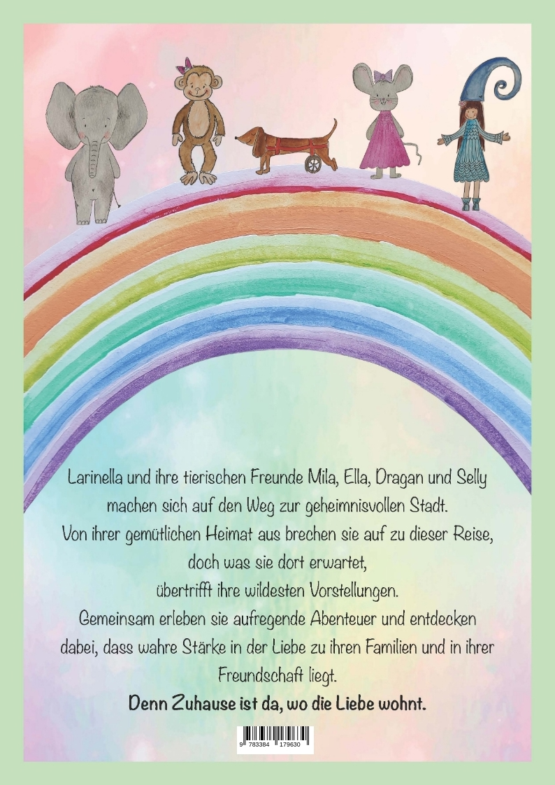 Larinella und ihre tierischen Freunde Mila, Ella, Dragan und Selly machen sich auf den Weg zur geheimnisvollen Stadt.Von ihrer gemütlichen Heimat aus brechen sie auf zu dieser Reise, doch was sie dort erwartet,übertrifft ihre wildesten Vorstellungen.Gemeinsam erleben sie aufregende Abenteuer und entdecken dabei, dass wahre Stärke in der Liebe zu ihren Familien und in ihrer Freundschaft liegt.Denn Zuhause ist da, wo die Liebe wohnt.