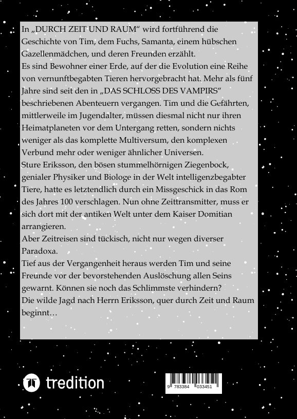 In "DURCH ZEIT UND RAUM" wird fortführend die Geschichte von Tim, dem Fuchs , Samanta , einem hübschen Gazellenmädchen, und deren Freunden erzählt. Es sind Bewohner einer Erde, auf der die Evolution eine Reihe von vernunftbegabten Tieren hervorgebracht hat. Mehr als fünf Jahre sind seit den in "DAS SCHLOSS DES VAMPIRS" beschriebenen Abenteuern vergangen. Tim und die Gefährten, mittlerweile im Jugendalter, müssen diesmal nicht nur ihren Heimatplaneten vor dem Untergang retten, sondern nichts weniger als das komplette Multiversum , den komplexen Verbund mehr oder weniger ähnlicher Universen. Sture Eriksson, den bösen stummelhörnigen Ziegenbock, genialer Physiker und Biologe in der Welt intelligenzbegabter Tiere, hatte es ja letztendlich durch ein Missgeschick in das Rom des Jahres 100 verschlagen. Nun ohne Zeittransmitter, muss er sich dort mit der antiken Welt unter dem Kaiser Domitian arrangieren. Auch in der Absicht, die Zukünftigen auf seinen Verbleib aufmerksam zu machen, gelingt ihm innerhalb weniger Jahre der Umbau des Alten Roms zum Neuen Römischen Reich, dessen zweiter Mann im Staate er wird. Aber Zeitreisen sind tückisch, nicht nur wegen diverser Paradoxa. Letztlich droht durch die jahrelange Intervention des Ziegenbocks die gesamte Raumzeit aus den Fugen zu geraten, mit überaus fatalen Folgen für alles was ist, jemals war oder sein wird. Hier nun kommen die Atlantiden auf den Plan, die in ihrer neuen Heimat von irgendwem vor genau diesem Szenario gewarnt werden muss. Tief aus der Vergangenheit heraus nehmen die Herren Zok und Zak Kontakt zu Tim und dessen Gefährten auf, und die wilde Jagd der New Agents des Time Security Corps nach Herrn Eriksson, quer durch Raum und Zeit beginnt. Verursacht durch bereits manifestierte Brüche im Gefüge der Raumzeit, geht bei der ohnehin komplizierten Mission schief, was nur schief gehen kann. Anstatt im Jahr 100 neuer Zeitrechnung im antiken Römische Reich der Tiererde zu landen um dort Sture Eriksson das Handwerk zu legen, verschlägt es die Gruppe zunächst in einen parallelen Realitätsstrang. Statt 1916 Jahre in die Vergangenheit ihres Planeten zu reisen , finden sich die fünf Reisenden im Jahr 2068 einer anderen Erde wieder. Es ist der durch Kriege und Umweltkatastrophen heruntergekommene, für jedermann gefährliche Heimatort der sogenannten Menschen in dem das Zeitreise-Team nun klarkommen muss und dabei zu keiner Zeit ihre eigentliche Mission aus den Augen verlieren darf . Aber der Trupp um Herrn Kasakow, den mit vielen Wassern gewaschenen alten Polarbären, also Tim, Samanta und nicht zuletzt die beiden großen biotransformierten Vampirfledermäuse Dogo und Jamil, stellt sich allen Herausforderungen und agiert mutig und mit viel Verstand. Allerdings bewahrt das die Gruppe nicht vor weiteren Verirrungen im unendlichen Ozean der Raumzeit des Multiversums. Ob auf einem höchst seltsamen Planeten oder im Alten Ägypten der Menschen-Erde, die Bedrängnisse wollen kein Ende nehmen. Für Tim und Samanta kulminiert die Angelegenheit schließlich, als sie im Oktober des Jahres 2156 im Berlin der Menschenwelt stranden. Es ist eine postapokalyptische Stadt, in der sie gezwungen sind, um ihr nacktes Leben zu kämpfen. Werden die beiden dort überleben? Hat die Menschenwelt eine Chance auf Fortbestand? Und vor allem: Ist das Multiversum als solches überhaupt noch zu retten ... ?Der vorliegende Roman setzt die Handlung meines Erstlings "Das SCHLOSS DES VAMPIRS" fort. Im Gegensatz zu diesem handelt es sich allerdings um kein Buch für jünger Schulkinder , sondern um eine Erzählung für Jugendliche. Selbstverständlich sollten auch Erwachsene, an dem Plot ihre Freude haben. Sofern sie nicht auf ausufernde Darstellungen von Mord und Totschlag besonderen Wert legen. Das Buch gliedert sich in, zumeist auch für sich selbst stehende Teile, z. B. die Schilderung einer Familientragödie in Kemet, also dem antiken Ägypten. Oder die Fragestellung nach den Perspektiven der "Menschen-Erde", leider der unseren.
