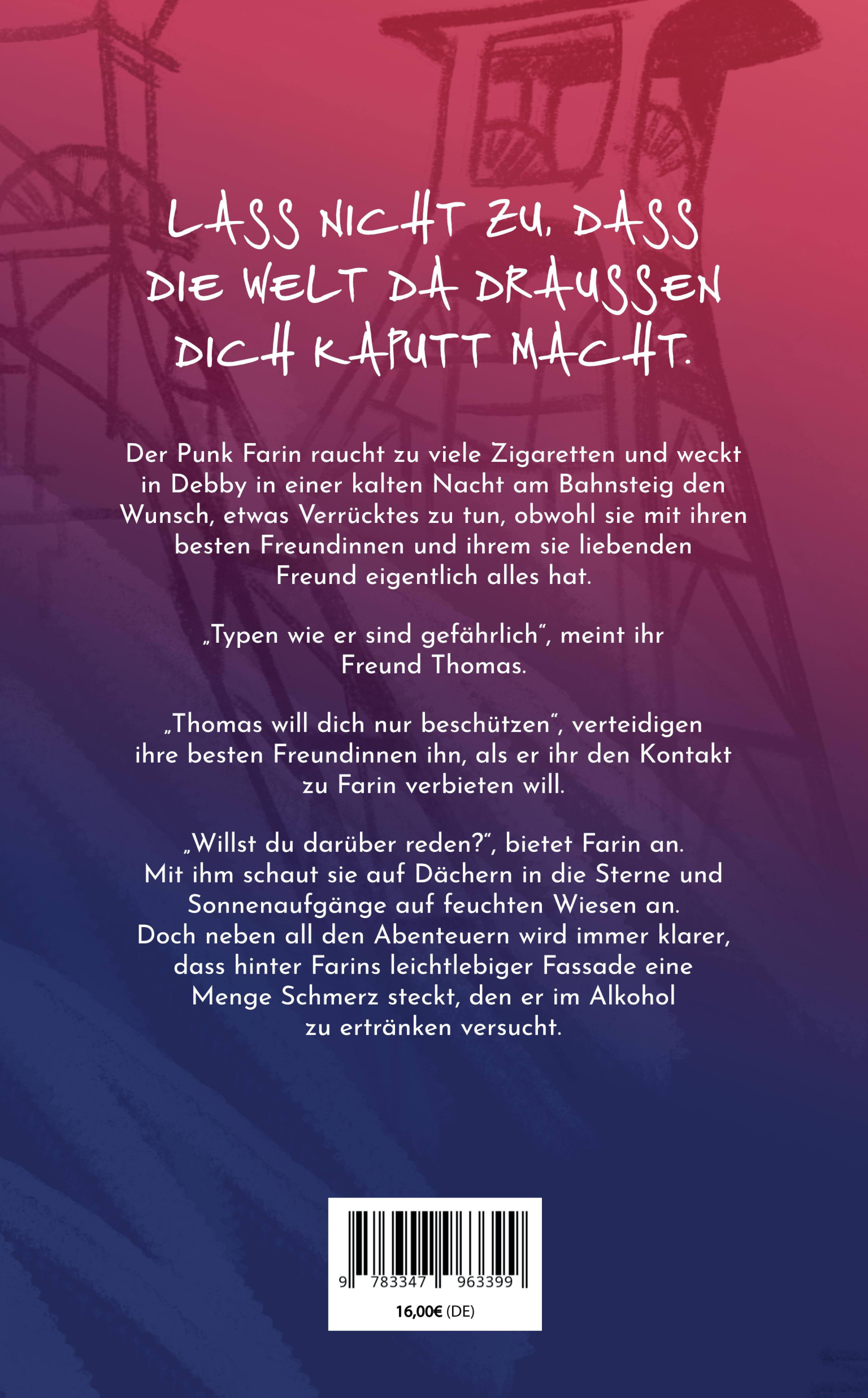 Lass nicht zu, dass die Welt da draußen dich kaputt macht.Der Punk Farin raucht zu viele Zigaretten und weckt in Debby in einer kalten Nacht am Bahnsteig den Wunsch, etwas Verrücktes zu tun, obwohl sie mit ihren besten Freundinnen und ihrem sie liebenden Freund eigentlich alles hat. "Typen wie er sind gefährlich", meint ihr Freund Thomas. "Thomas will dich nur beschützen", verteidigen ihre besten Freundinnen ihn, als er ihr den Kontakt zu Farin verbieten will."Willst du darüber reden?", bietet Farin an. Mit ihm schaut sie auf Dächern in die Sterne und Sonnenaufgänge auf feuchten Wiesen an. Doch neben all den Abenteuern wird immer klarer, dass hinter Farins leichtlebiger Fassade eine Menge Schmerz steckt, den er im Alkohol zu ertränken versucht.