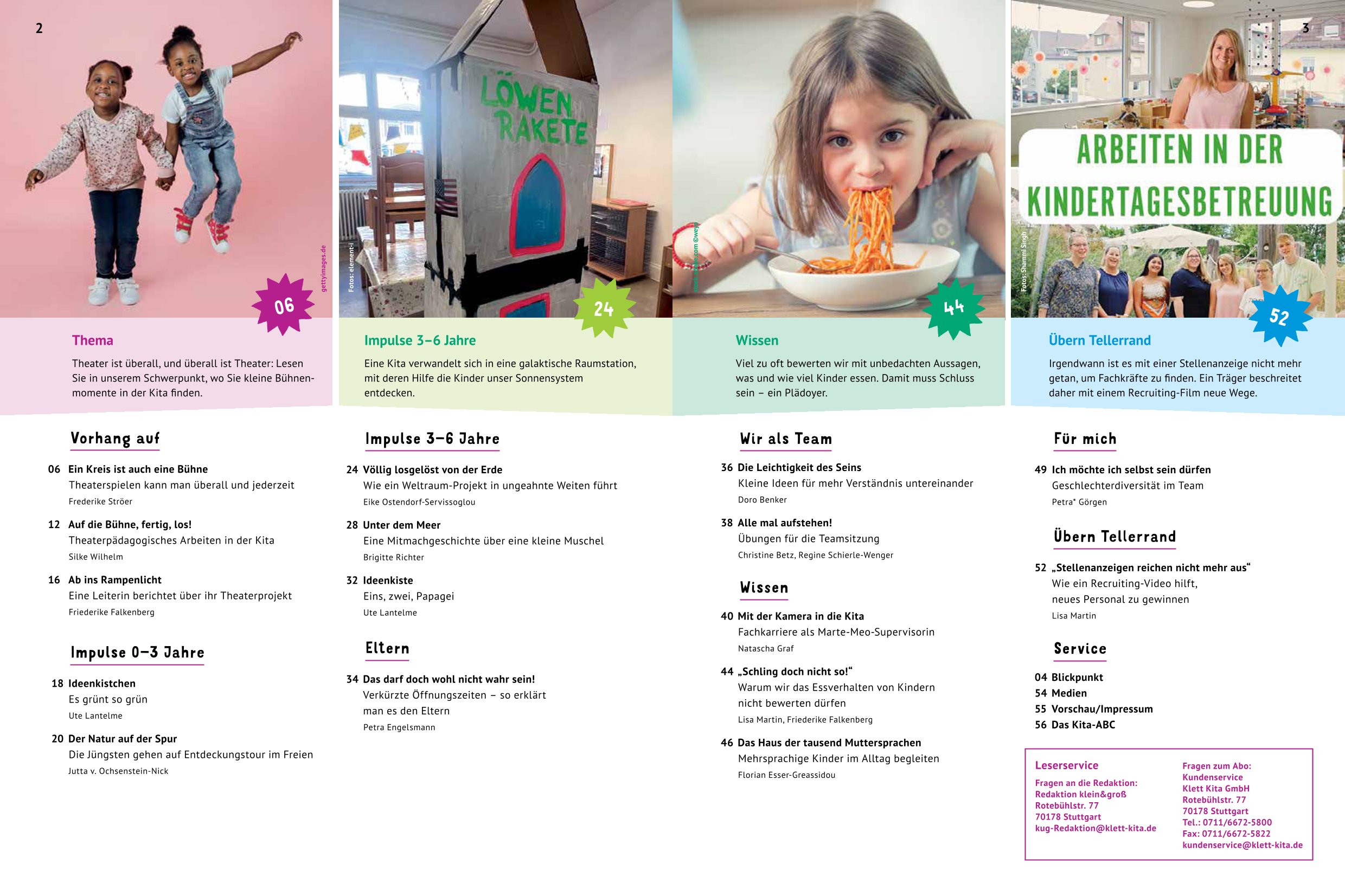 Vorhang auf für die Kinder! Theater spielen funktioniert nicht nur auf großen Bühnen. In der Kita können Kinder genauso zu Schauspieler:innen werden. In dieser Ausgabe findet jede:r eine passende Rolle und lernt, dass bunte Tücher zu einem schönen Kostüm werden, zurückhaltende Kinder die größten Stars werden können und ein Kreis sehr wohl eine Bühne sein kann. Denn Theater spielen kann man immer und jederzeit.