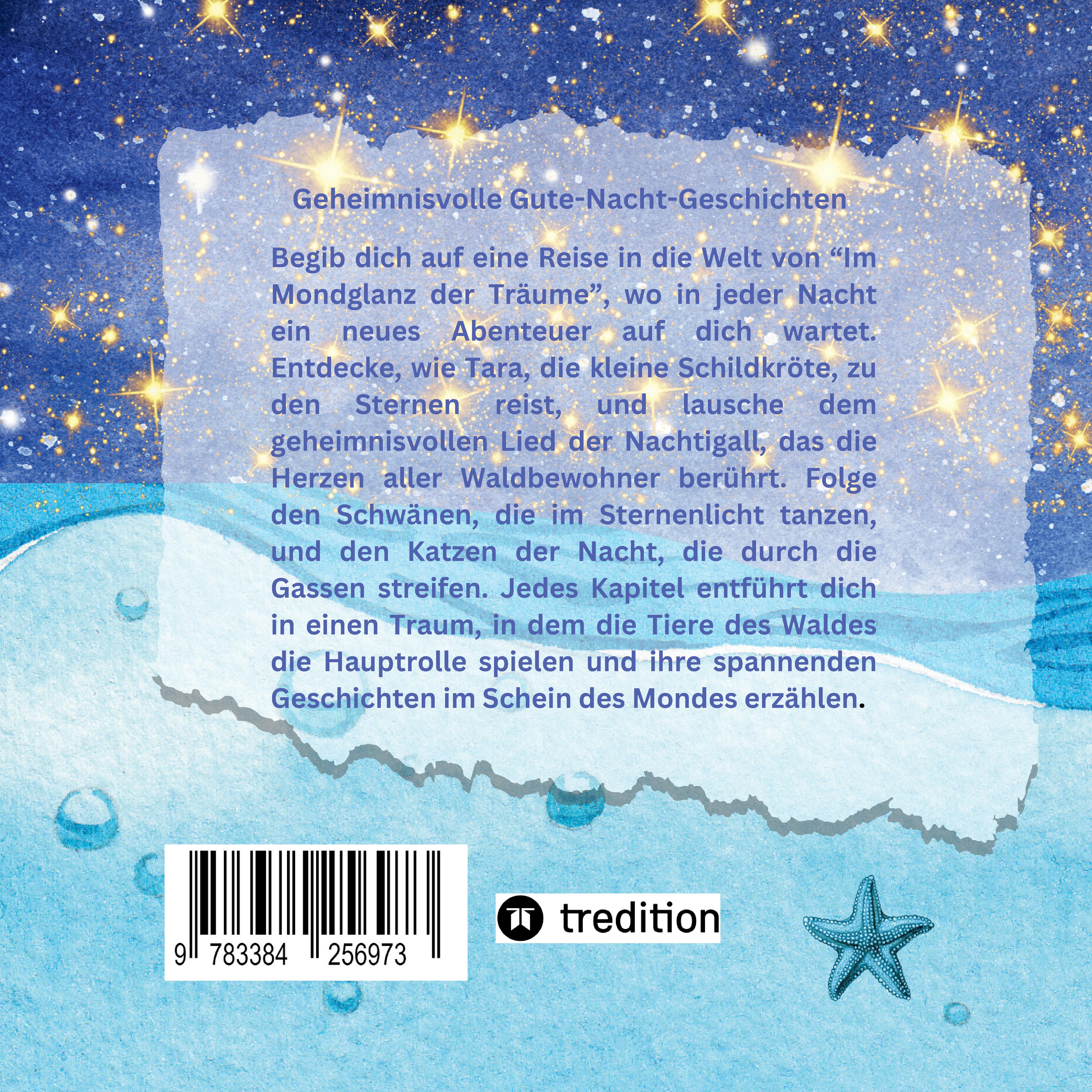 Begib dich auf eine Reise in die Welt von "Im Mondglanz der Träume", wo in jeder Nacht ein neues Abenteuer auf dich wartet. Entdecke, wie Tara, die kleine Schildkröte, zu den Sternen reist und lausche dem geheimnisvollen Lied der Nachtigall, das die Herzen aller Waldbewohner berührt. Folge den Schwänen, die im Sternenlicht tanzen und den Katzen der Nacht, die durch die Gassen streifen. Jedes Kapitel entführt dich in einen Traum, in dem die Tiere des Waldes die Hauptrolle spielen und ihre Geschichten im Schein des Mondes erzählen. "Im Mondglanz der Träume" ist ein Buch, das dich einlädt, die Magie der Nacht zu erleben und mit den Augen der Fantasie die Wunder der Natur zu erkunden.