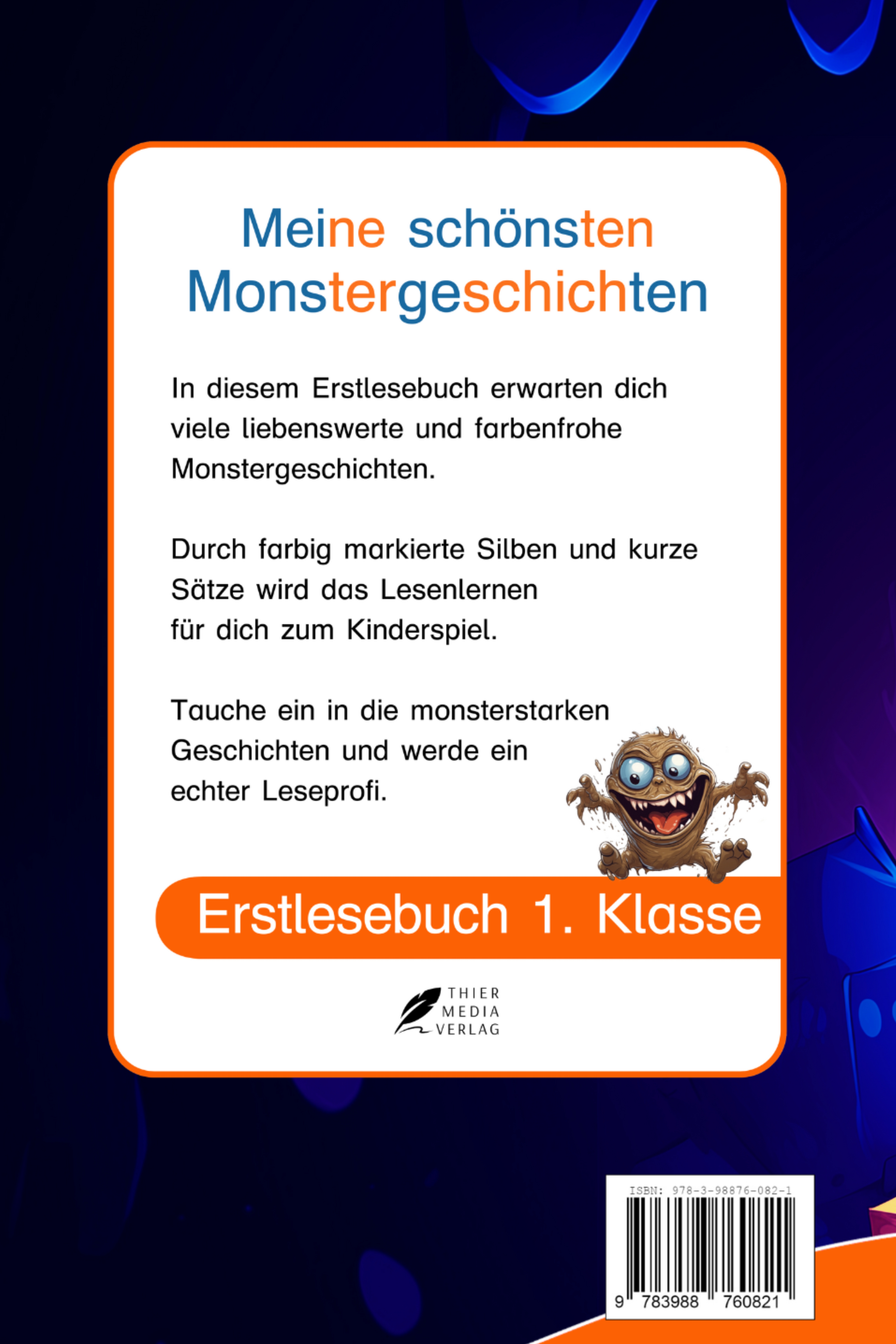 Meine schönsten Monstergeschichten Suchen Sie ein gutes Buch für Ihr Kind in der 1. Klasse?Liest Ihr Kind bereits einfache Wörter und kurze Sätze?Mag Ihr Kind farbenfrohe und liebenswerte Monstergeschichten?Falls ja, dann ist dieses Erstlesebuch genau das Richtige!Durch farbig markierte Silben und kurze Sätze wird das Lesenlernen zum Kinderspiel.Unsere bunten und lebendigen Geschichten animieren Kinder zum Weiterlesen.Beobachten Sie, wie Ihr Kind langsam zu einem echten Leseprofi wird.