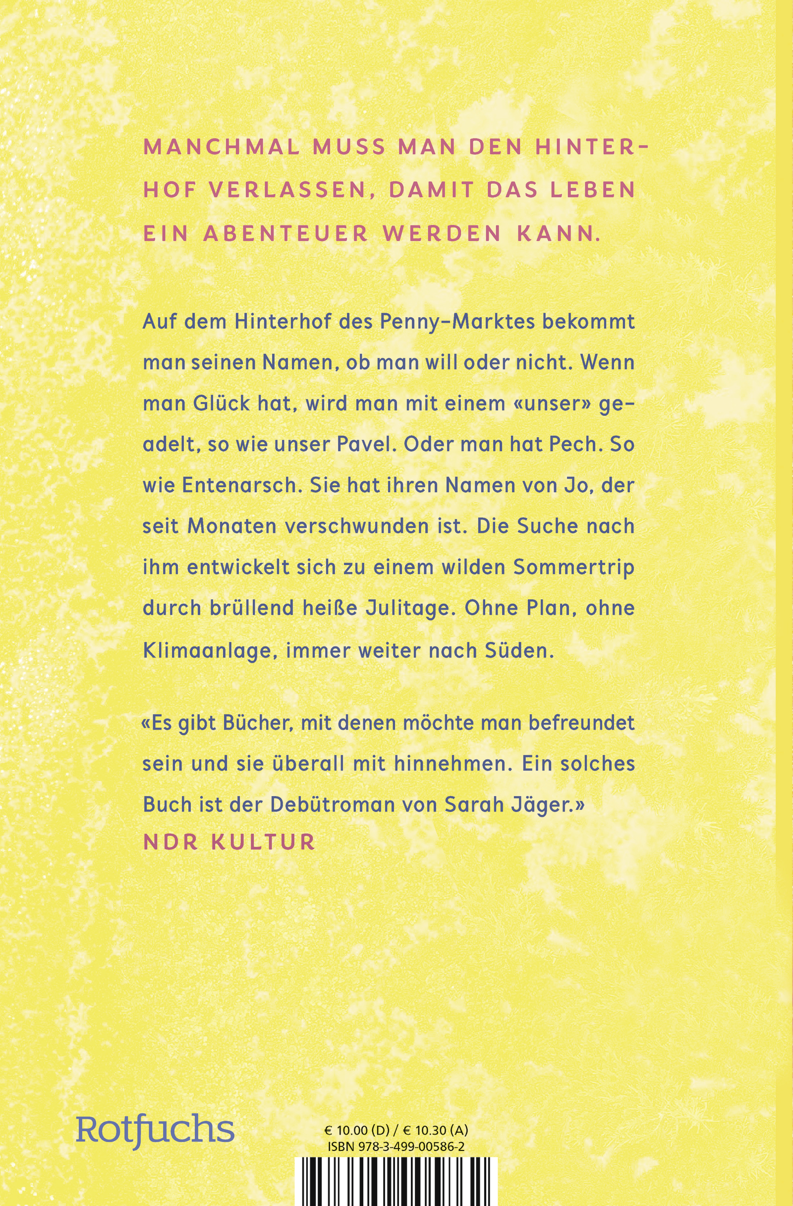 Der Hinterhof des Pennymarktes ist mehr als ein Hinterhof für Lena, auch genannt «Entenarsch». Denn hier bekommt man seinen Namen, ob man will oder nicht. Entenarsch hat ihren von Jo, der vor einigen Wochen einfach verschwunden ist. Jo, der mit Marie zusammen war. Und an deren Trennung Entenarsch nicht ganz unschuldig ist. Entenarsch, Marie und Can beschließen, Jo zu suchen - aus den unterschiedlichsten Motiven. Ihre Fahrt durch brüllend heiße Sommertage führt sie immer weiter in den Süden, bis zu einem riesigen Musikfestival. Und während Jo wie vom Erdboden verschluckt scheint, versammeln sich um die drei Suchenden immer mehr gute Bekannte vom Hinterhof. Am Ende wird Entenarsch am Meer auf Jo treffen. Und wird nie wieder Entenarsch genannt werden.