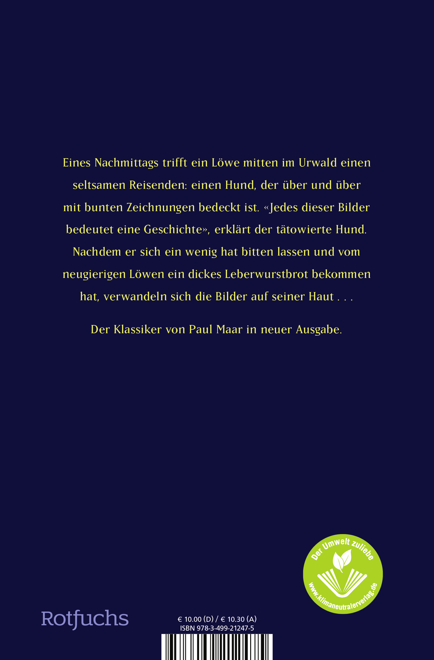 Eines Nachmittags trifft ein Löwe mitten im Urwald einen seltsamen Reisenden: einen Hund, der über und über mit bunten Zeichnungen bedeckt ist. «Jedes dieser Bilder bedeutet eine Geschichte», erklärt der tätowierte Hund. Nachdem er sich ein wenig hat bitten lassen und vom neugierigen Löwen ein dickes Leberwurstbrot bekommen hat, verwandeln sich die Bilder auf seiner Haut . . .