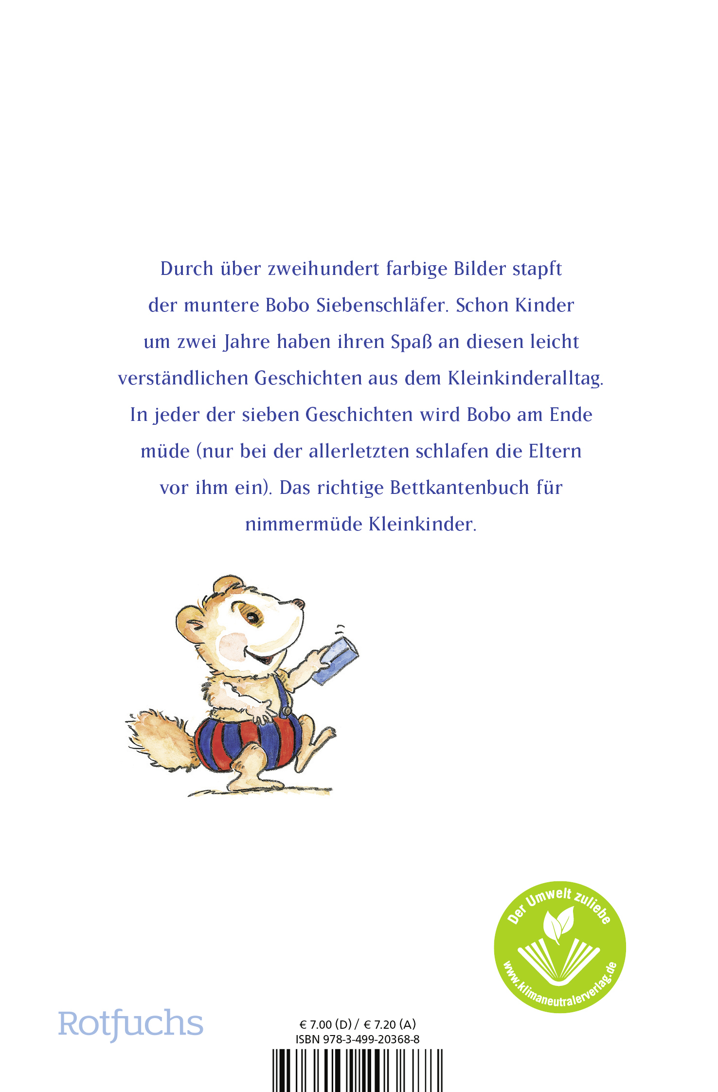 Durch über zweihundert farbige Bilder stapft der muntere Bobo Siebenschläfer. Schon Kinder um zwei Jahre haben ihren Spaß an diesen leicht verständlichen Geschichten aus dem Kleinkinderalltag. In jeder der sieben Geschichten wird Bobo am Ende müde (nur bei der allerletzten schlafen die Eltern vor ihm ein). Das richtige Bettkantenbuch für nimmermüde Kleinkinder.