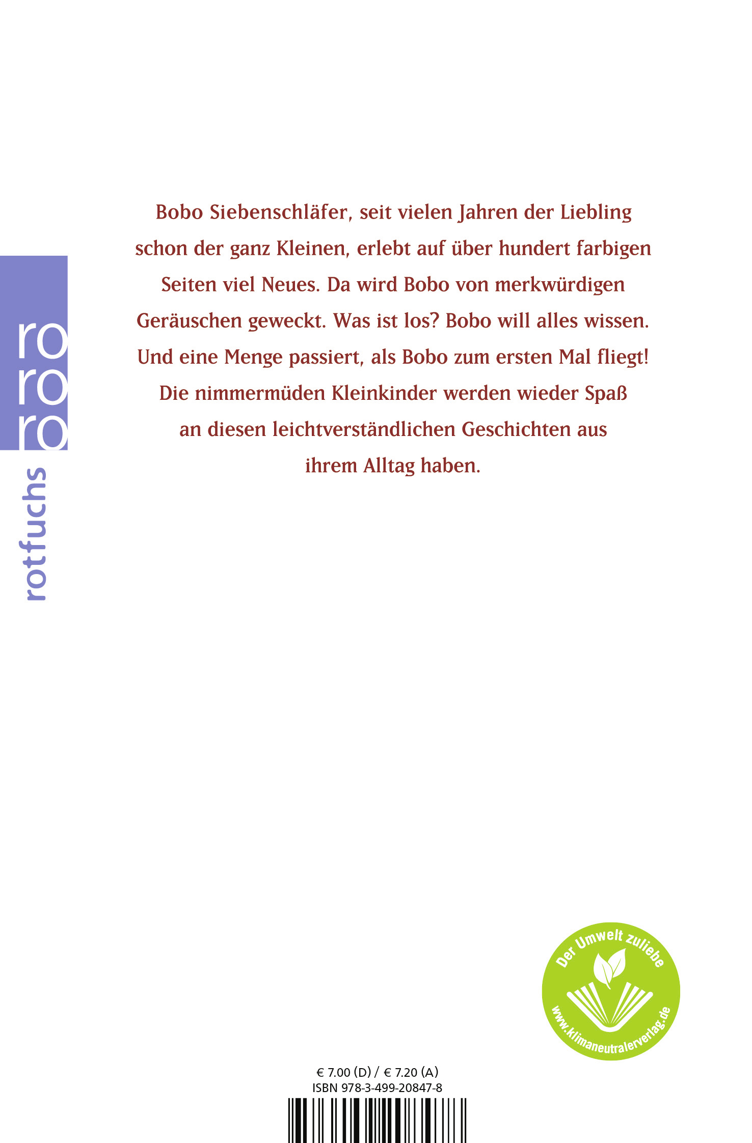 Bobo Siebenschläfer, seit vielen Jahren der Liebling schon der ganz Kleinen, erlebt auf über hundert farbigen Seiten viel Neues. Da wird Bobo von merkwürdigen Geräuschen geweckt. Was ist los? Bobo will alles wissen. Und eine Menge passiert, als Bobo zum ersten Mal fliegt! Die nimmermüden Kleinkinder werden wieder Spaß an diesen leichtverständlichen Geschichten aus ihrem Alltag haben.