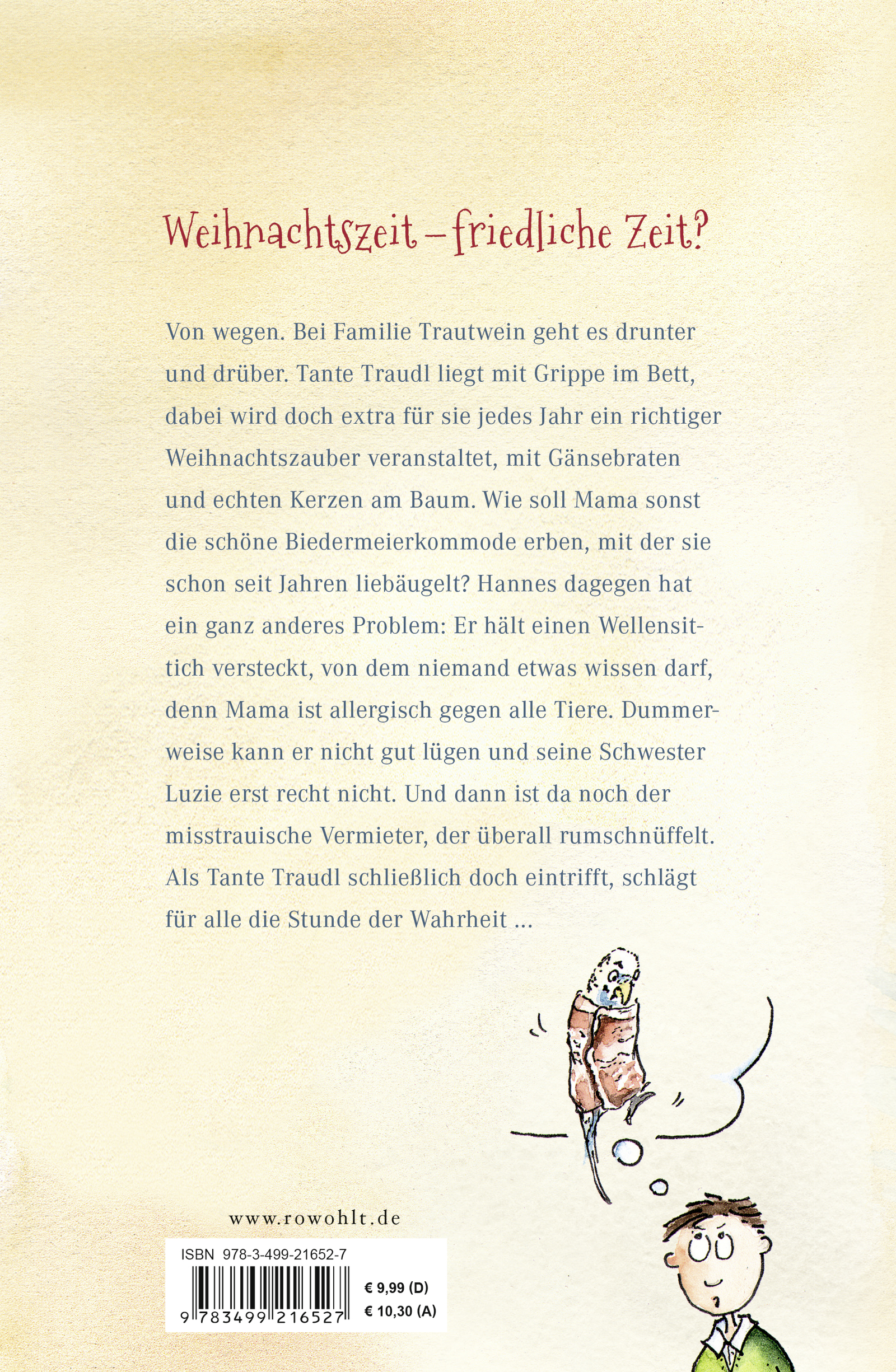 Von wegen. Bei Familie Trautwein geht es drunter und drüber. Tante Traudl liegt mit Grippe im Bett, dabei wird doch extra für sie jedes Jahr ein richtiger Weihnachtszauber veranstaltet, mit Gänsebraten und echten Kerzen am Baum. Wie soll Mama sonst die schöne Biedermeierkommode erben, mit der sie schon seit Jahren liebäugelt? Hannes dagegen hat ein ganz anderes Problem: Er hält einen Wellensittich versteckt, von dem niemand etwas wissen darf, denn Mama ist allergisch gegen alle Tiere. Dummerweise kann er nicht gut lügen und seine Schwester Luzie erst recht nicht. Und dann ist da noch der misstrauische Vermieter, der überall rumschnüffelt. Als Tante Traudl schließlich doch eintrifft, schlägt für alle die Stunde der Wahrheit ...