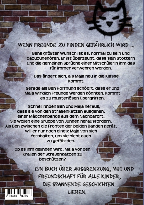 Wenn Freunde zu finden gefährlich wird ...Bens größter Wunsch ist es, normal zu sein und dazuzugehören. Er ist überzeugt, dass sein Stottern und die gemeinen Sprüche einer Mitschülerin ihm das für immer verwehren werden. Das ändert sich, als Maja neu in die Klasse kommt. Gerade als Ben Hoffnung schöpft, dass er und Maja wirklich Freunde werden könnten, kommt es zu mysteriösen Übergriffen.Schnell finden Ben und Maja heraus, dass sie von den Straßenkatzen ausgehen, einer Mädchenbande aus dem Nachbarort. Sie wollen eine Gruppe von Jungen herausfordern. Als Ben zwischen die Fronten der beiden Banden gerät, will er nur noch eines: Maja von sich fernhalten, um sie nicht auch zu gefährden. Ob es ihm gelingen wird, Maja vor den Krallen der Straßenkatzen zu beschützen?Ein Buch über Ausgrenzung, Mut und Freundschaft für alle Kinder, die spannende Geschichten lieben.