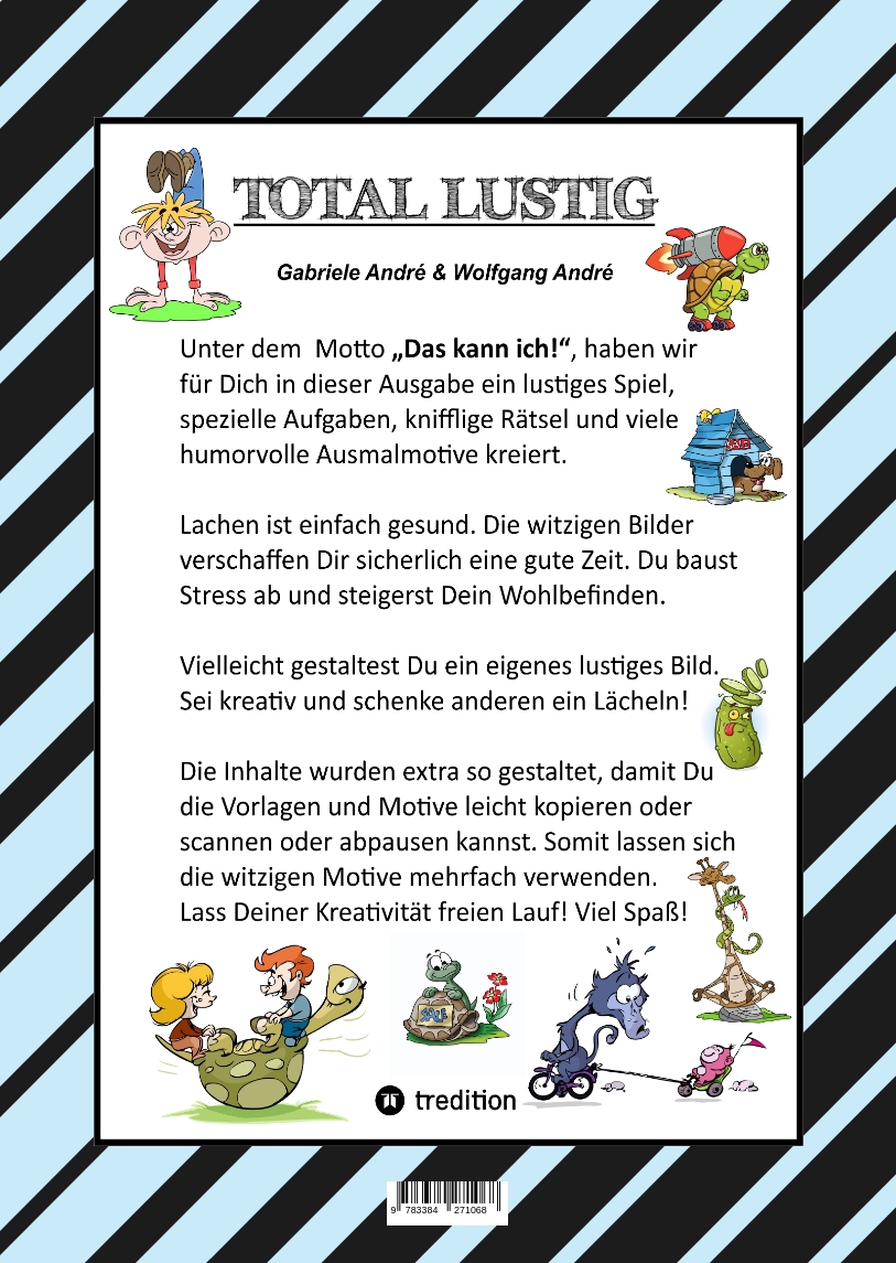 | Schlagworte | amüsant • Basteln • belustigend • Craftbook • Droll • Familie • Familienspass • Freude • Fröhlichkeit • Glück • Heiterkeit • Humor • Humoristisch • humorvoll • Ideen • JUST FUNNY • Kreativität • Lachen • Lernen • Malen • Rätsel • Spass • Team • Unterhaltung • Witz • Zeichnen |