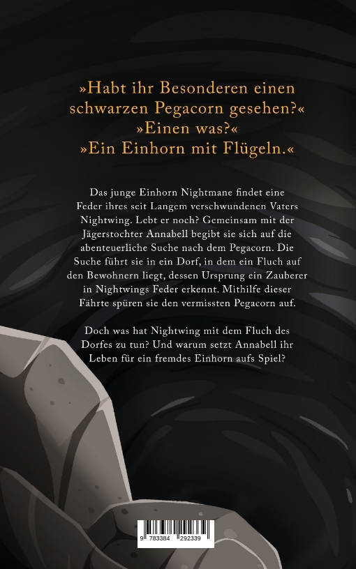 Das junge Einhorn Nightmane findet eine Feder ihres seit Langem verschwundenen Vaters Nightwing. Lebt er noch? Gemeinsam mit der Jägerstochter Annabell begibt sie sich auf die abenteuerliche Suche nach dem Pegacorn. Die Suche führt sie in ein Dorf, in dem ein Fluch auf den Bewohnern liegt, dessen Ursprung ein Zauberer in Nightwings Feder erkennt. Mithilfe dieser Fährte spüren sie den vermissten Pegacorn auf.Doch was hat Nightwing mit dem Fluch des Dorfes zu tun? Und warum setzt Annabell ihr Leben für ein fremdes Einhorn aufs Spiel?