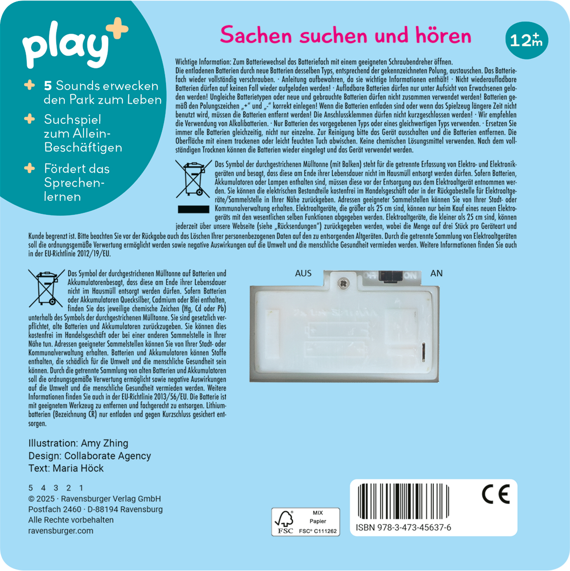 Großer Such-Spaß mit spannenden Park-Geräuschen Wer bellt denn da so laut? Und wo saust Noah auf seinem Laufrad lang? Im Park gibt es viel Aufregendes zu suchen und finden. 5 lustige Geräusche machen die Entdeckungsreise auf dem Spielplatz, am Teich und im Regen für Kinder ab 12 Monaten noch spannender. Dank der großen, leicht zu drückenden Knöpfe auf jeder Seite ist der Spielspaß mit diesem Buch nahezu unendlich. Die liebevollen Texte und plakativen Suchbilder benennen spannende Details in den Bildern und regen die Sprachentwicklung an. Play+, die neue Baby- und Kleinkindlinie, fokussiert auf eine ganzheitliche frühkindliche Förderung – mit der gesamten Erfahrung der Marke Ravensburger. Die abwechslungsreichen Bücher und Spielzeuge von Play+ garantieren Kindern von 0-3 Jahren jede Menge Spaß und ermöglichen ein spielerisches Lernen und Entdecken – egal ob gemeinsam oder auch allein. Die Bedürfnisse der Kinder und die Anforderungen der Eltern bestimmen die Entwicklung aller Produkte. Der Blick fürs Detail, das besondere Extra und eine moderne Gestaltung machen das Programm von Play+ aus, immer unter Einhaltung der hohen Ravensburger Sicherheits- und Qualitätsansprüche. Denn sicher ist sicher.