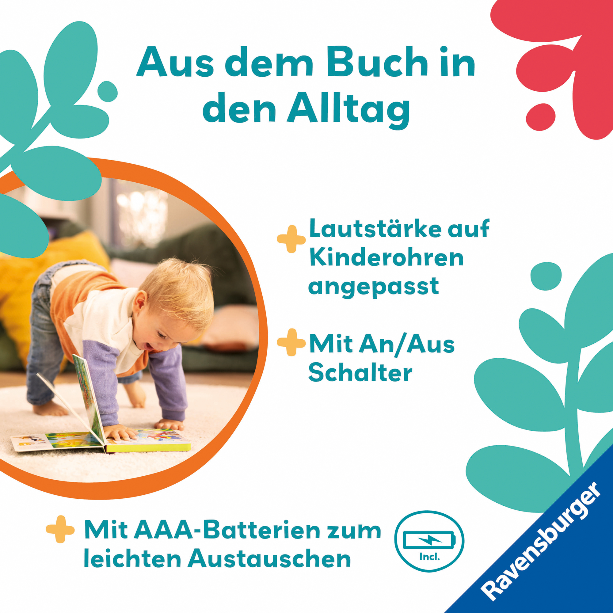 Großer Such-Spaß mit lustigen Kindergarten-Geräuschen Wer lacht da so fröhlich? Und wer macht Quatsch im Waschraum? Im Kindergarten gibt es viel Aufregendes zu suchen und finden. 5 lustige Geräusche machen die Entdeckungsreise im Gruppenraum, beim Essen und beim Spielen für Kinder ab 12 Monaten noch spannender. Dank der großen, leicht zu drückenden Knöpfe auf jeder Seite ist der Spielspaß mit diesem Buch nahezu unendlich. Die liebevollen Texte und plakativen Suchbilder benennen spannende Details in den Bildern und regen die Sprachentwicklung an. Play+, die neue Baby- und Kleinkindlinie, fokussiert auf eine ganzheitliche frühkindliche Förderung – mit der gesamten Erfahrung der Marke Ravensburger. Die abwechslungsreichen Bücher und Spielzeuge von Play+ garantieren Kindern von 0-3 Jahren jede Menge Spaß und ermöglichen ein spielerisches Lernen und Entdecken – egal ob gemeinsam oder auch allein. Die Bedürfnisse der Kinder und die Anforderungen der Eltern bestimmen die Entwicklung aller Produkte. Der Blick fürs Detail, das besondere Extra und eine moderne Gestaltung machen das Programm von Play+ aus, immer unter Einhaltung der hohen Ravensburger Sicherheits- und Qualitätsansprüche. Denn sicher ist sicher.