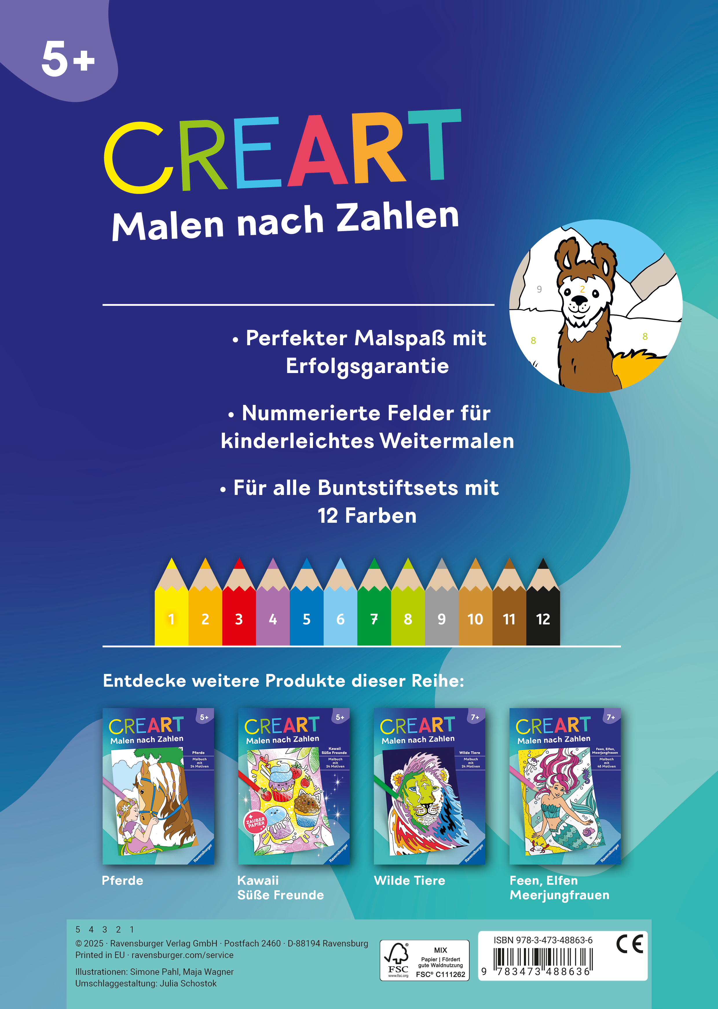 Süße Tiere – Motive malen wie die Profis – mit diesem Malbuch kein Problem! Das Malbuch enthält viele niedliche Ausmalmotive rund um das Thema Süße Tiere. Wunderschöne Bilder der beliebtesten Tiere machen viel Freude. Durch altersgerechte Motive und nummerierte Ausmalfelder ist das Weitermalen kinderleicht. Kleine Flächen sind vorkoloriert. So entstehen im Handumdrehen perfekte Kunstwerke. Die Zahlen sind so zart, dass sie beim Übermalen verschwinden. Die Farbpalette der Motive entspricht handelsüblichen Stiftpackungen. Die Ravensburger Erfolgsreihe CreArt - Malen nach Zahlen macht Malen zum Kinderspiel: Alle Ausmalfelder enthalten Zahlen, die die Farben vorgeben. Feld für Feld entstehen so ansprechende, detailreiche Bilder. Kinder malen erfolgreich auch anspruchsvolle Motive, wie Dinosaurier, Pferde oder Meerjungfrauen. Die Malbuch-Reihe enthält Angebote für zwei Altersstufen: ab 5 Jahren und ab 7 Jahren. Je nach Alter variiert die Größe der Malflächen. Sehr kleine Flächen sind vorgefärbt. Die Farbe der Zahlen erleichtert Vorschulkindern zudem die Zuordnung. So können die Kinder ganz nebenbei die Zahlen lernen. CreArt - Malen nach Zahlen gibt es auch mit Überraschungseffekt. In Heften mit Zauberpapier werden beim Ausmalen zusätzlich versteckte Details sichtbar. Das ist magisch und motiviert zum Fertigmalen. CreArt ist Malspaß mit Erfolgsgarantie und ein perfektes Geschenk für Mädchen und Jungen.