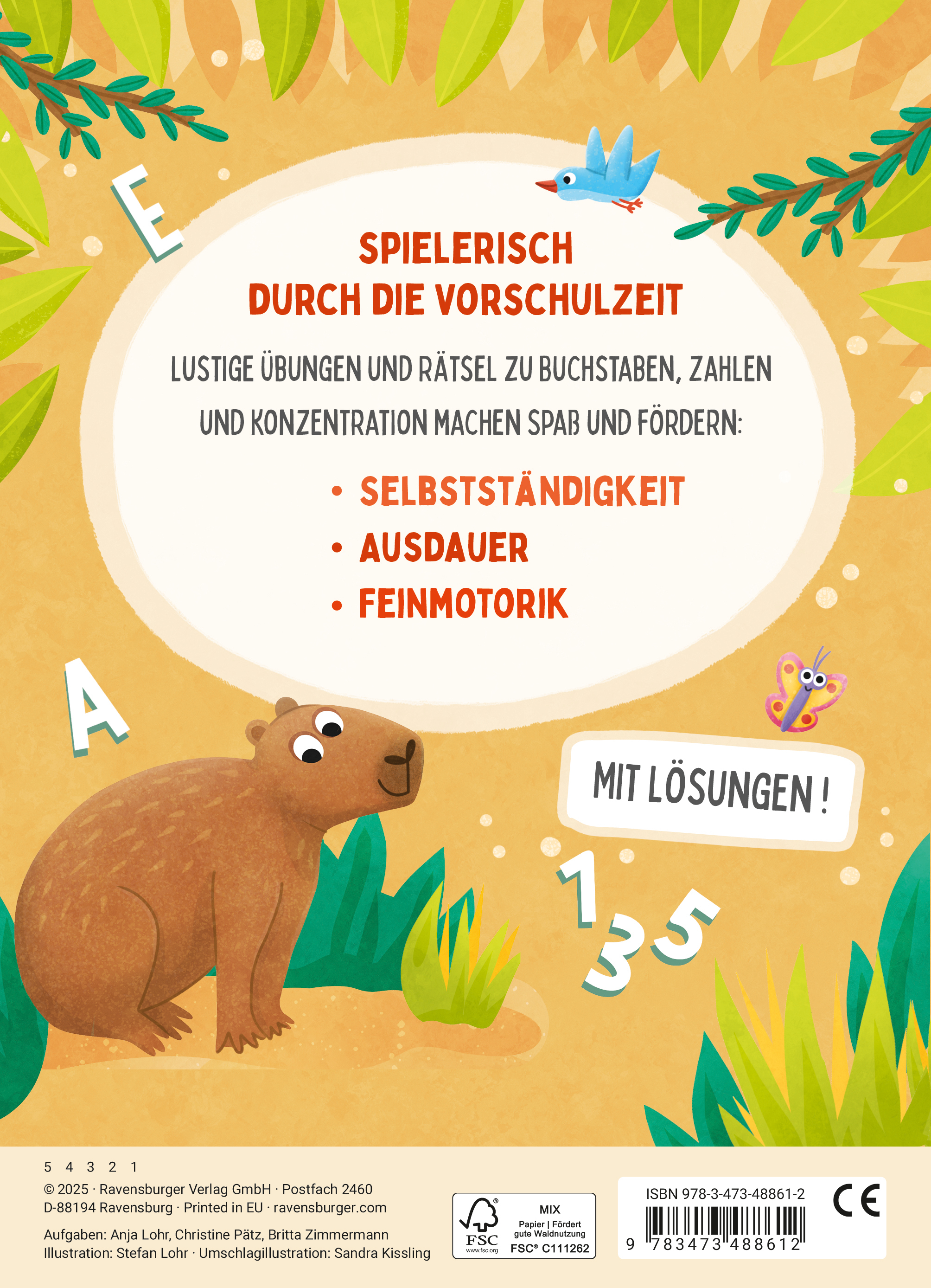 Rätsel für die Vorschule ab 5 Jahren Spannende Buchstabenrätsel, Labyrinthe, kleine Spiele sowie Schreib- und Leseübungen bereiten auf die Einschulung vor. Mit lustigen Tierillustrationen üben Kinder genaues Schauen, Vergleichen und Konzentration. Beim Abzählen der Spielzeuge des kleinen Bären erkennen und schreiben sie Zahlen, mit Igel und Maus lernen sie erste Buchstaben kennen. Spielerisch werden so Fähigkeiten für die Vorschule und Grundlagen zu ersten Schulthemen wie das Lesen, Rechnen und Schreiben vermittelt. In diesem umfangreichen Rätselblock entdecken Kinder abwechslungsreiche Spiele und Übungen zur Vorbereitung auf die Schule: Mal- und Motorikspiele, Wahrnehmungsspiele und Übungen zu Buchstaben, Zahlen und Formen. Die lustigen Motive laden dabei zum Ausmalen ein und motivieren immer wieder neu.