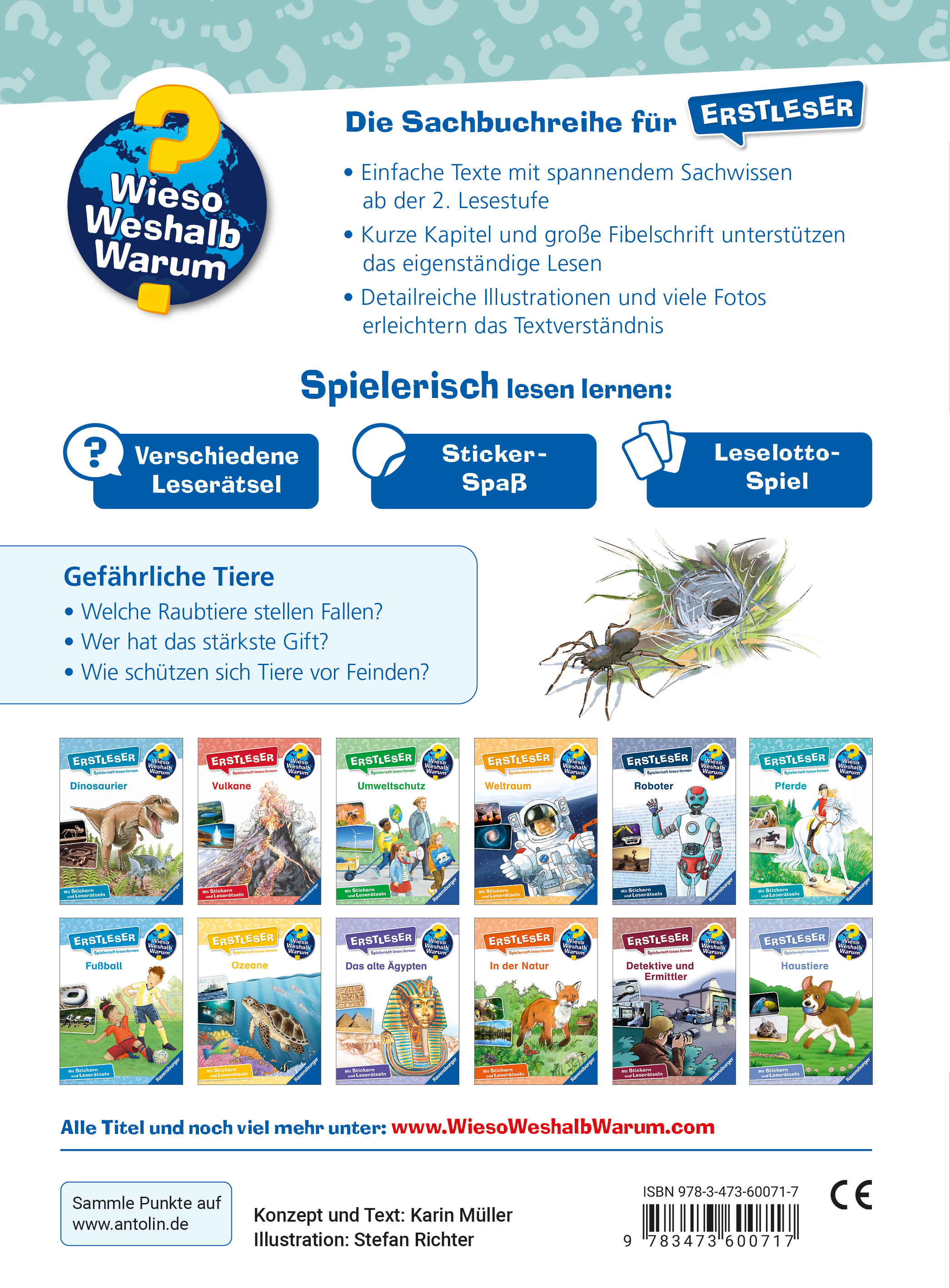 Gefräßige Krokodile, giftige Kobras, gefährliche Haie – alles über ihre Techniken, Tricks und Überlebensstrategien Was sind die gefährlichsten Tiere der Welt? Wer hat die höchste Beißkraft? Welche Tiere stellen Fallen? All das finden Leserinnen und Leser hier Zeile für Zeile selbstständig heraus. Mithilfe einfacher Texte erfahren sie, welche Fleischfresser Gift einsetzen, wie sich Beutetiere gegen Angreifer wehren und wie wir Menschen uns vor bedrohlichen Tieren schützen können. Anschauliche Illustrationen und Fotos unterstützen dabei. Und für jede Menge Spaß sorgen Sticker, ein Spiel und viele Rätsel. Wieso? Weshalb? Warum? Erstleser Die Sachbuchreihe für Kinder ab der 2. Lesestufe Lesetraining, Sachwissen und Spielspaß in einem! Mit der Reihe Wieso? Weshalb? Warum? Erstleser erschließen sich Kinder ihre Lieblingsthemen selbst. In vier Kapiteln beantworten die Bücher brennende Kinderfragen in kurzen, leicht verständlichen Sätzen. Wie lebt man auf einer Raumstation? Welche Sprache sprechen Wale? Wie gefährlich ist ein Vulkan? Illustrationen und Fotos helfen den Kindern dabei, das Gelesene zu verstehen. Zusätzlich gibt es am Ende jedes Kapitels Buchstaben- und Kreuzworträtsel, Suchbilder, Sudokus und vieles mehr. Ganze acht Seiten mit unterschiedlichsten Rätseln und ein Lesequiz laden zum Knobeln ein. Ein Leselotto-Spiel hilft beim Verständnis schwieriger Wörter. Auf einer Stickerseite zeigen Texte, wo welcher Aufkleber hingehört. Spielerisch lesen lernen wird hier großgeschrieben.