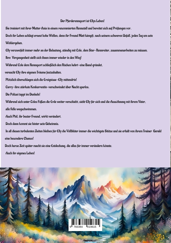 Endlich ist Ellys u.Matts Liebe für sie greifbar.Sie soll unerschütterlich werden!Sie müssen sich nicht schämen,dürfen ihre Gefühle ausleben,denn sie haben die Gewissheit, dass sie keine Geschwister sind!Elly kann sich endlich auf Prüfungen als angehende Rennreiterin vorbereiten und Matt, ihre große Liebe, kann sie voll unterstützen.Jedenfalls theoretisch,doch er ist seit seinem Autounfall an den Rollstuhl gebunden u.gefangen zwischen Rehasport und der Angst, nie mehr laufen zu können. Elly beginnt den Spagat zwischen der harten Wahrheit d.Pferderennsports,Rehaklinik u.Matts Bedürfnissen.Ihr Vater verschließt weiter sein Herz vor den Wahrheiten des Lebens.Als Elly ihn besucht,weiß sie nicht, ob es eine gute Idee ist, dem ehemaligen zu Hause nahe zu sein oder ob er ihre Annäherung als Angriffsfläche nutzt.Zum Glück gibt es Sandy, Rene, Phil, ihre besten Freunde.Das Kleeblatt.Doch auch hier kommen Stürme auf.Phil birgt ein Geheimnis.Während Sandy eine junge Frau kennen lernt u. einsieht,dass ihre Gefühle sie zu ihr ziehen,ist es an Rene zu entscheiden,wie sein Leben weiterzugehen hat,bezüglich eines attraktiven Angebots.Ein Urlaub mit einzigartigen Momenten birgt für Elly,Matt u.die anderen nicht nur Freude,sondern auch wundersame Erfahrungen.Die nächste Runde Lebenswahrheiten wartet aber nicht.Cole, der Star-Rennreiter mit den eisgrauen Augen,lässt Ellys Welt erneut erzittern, als er ihr eröffnet, dass er, nachdem zwischen ihnen Schluss ist,ihr sicher nicht mehr dabei helfen wird,dass ihr Leben leichter wird.Es beginnt ein erbitterter,zeitweilen,stummer Kampf.Coles Welt dreht sich viel zu schnell,denn sein Kokainkonsum macht den sowieso schon berüchtigten Jockey zu einem gefährlichen Mitstreiter.Dann verliert er seine Rennreiterlizenz und hängt seine Energie an seine Band THE GREY WOLFES.Seine Verwandlung geht in die nächste Runde,doch da kommt wieder Phil ins Spiel,der daran mitzutragen hat.Carry,die ehemalige Freundin von Matt hängt immer noch an ihm.Der Hass auf Elly wird größer,denn jetzt ist Elly Matts Lebensmittelpunkt u.Carry erfährt,dass es in ihrer gemeinsamen Zeit schon so gewesen ist.Carrys Karriere ist bilderbuchmäßig u.ihre Erfolge als Jokette sind brillant.Doch nicht einmal ihr Vater scheint stolz zu sein.Endlich sieht Carry für sich einen Ausweg,die Spitze eines Eisberges in der Ferne ihrer Lebenslichter u.das soll Cole sein!In einer dunklen Nacht entscheidet sich Carry plötzlich für einen ganz anderen Weg-ab da gilt sie als vermisst.Die Polizei tappt im DUNKELN!Gerald Zenkler und Ania Grafenstein sind Trainer im Rennstall Krümelberg u. für den Erfolg von Elly u.anderen Angestellten vor Ort, verantwortlich.Elly trainiert gemeinsam mit ihrer Mutter und lernt sie immer besser kennen.Doch kann sie ihr verzeihen, dass sie Elly und die Familie im Stich gelassen hat, als Elly noch ein Kind war?Auch Gerald kämpft mit seinen Aufgaben als Trainer u. mit den Gefühlen zu Ania.Nach langen Tagen,noch längeren Nächten schafft es Elly,mit Opfern,endlich ihrer Karriere neuen Aufwind zu verschaffen und erhält von ihrem Trainer eine große Chance.Sie sammelt wertvolle Erfahrungen u. ihre gemeinsame Zukunft mit Matt kommt in eine entscheidende Phase.Doch dann macht Elly eine schockierende Entdeckung.Sie ist hin und her gerissen, ob sie diese Entdeckung mit ihrem vertrauten Umfeld teilen soll und gerät dadurch immer mehr in einen Strudel aus Selbstvorwürfen und Zweifeln,bis sie ein Notruf ereilt.Wird sie rechtzeitig an Ort und Stelle sein?