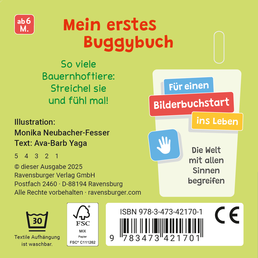Mein erstes Fühlbuch für unterwegs Das Pony hat einen langen Schweif, das Häschen kuschelig weiches Fell und die Kuh spannende Flecken. Fühlst du sie? Auf jeder Seite entdecken Kinder ab 6 Monaten erste Bauernhoftiere und dürfen diese mit allen Sinnen erkunden. Kurze Texte und Fühlteile laden zum Tasten und genauen Entdecken ein. Ferkel, Kuh und Hahn: in diesem Spielbuch können Kinder ab 6 Monaten ihre liebsten Bauernhoftiere streicheln und anfassen. Die kurzen Texte und die Fühlteile animieren dabei zum aktiven Mitmachen. Die Mini-Fühlbücher sind perfekt für unterwegs! Die kleinen Mitmachbücher passen in jede Handtasche und nehmen auch im Wickelrucksack wenig Platz ein. Durch die Buggy-Aufhängung lassen sie sich prima am Kinderwagen, Hochstuhl oder Kindersitz befestigen. Sie sind deshalb eine super Beschäftigung für die Autofahrt, Wartezeiten oder einfach zwischendurch.
