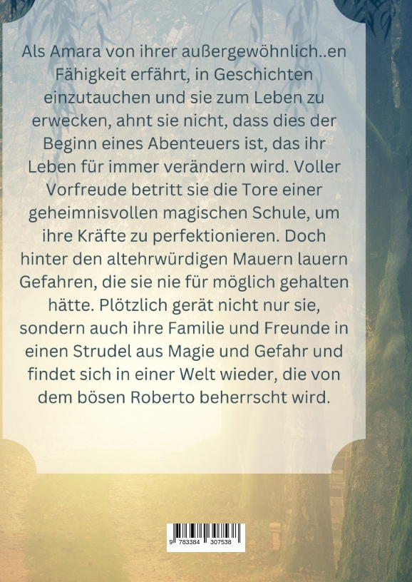 Willkommen auf Schloss Albertos - der magischen AcademyAls Amara von ihrer außergewöhnlichen Fähigkeit erfährt, in Geschichten einzutauchen und sie zum Leben zu erwecken, ahnt sie nicht, dass dies der Beginn eines Abenteuers ist, das ihr Leben für immer verändern wird. Voller Vorfreude betritt sie die Tore einer geheimnisvollen magischen Schule, um ihre Kräfte zu perfektionieren. Doch hinter den altehrwürdigen Mauern lauern Gefahren, die sie nie für möglich gehalten hätte. Plötzlich gerät nicht nur sie, sondern auch ihre Familie und Freunde in einen Strudel aus Magie und Gefahr und findet sich in einer Welt wieder, die von dem bösen Roberto beherrscht wird.Mit Mut, Klugheit und dem Beistand treuer Freunde muss Amara sich der Herausforderung stellen, ihre Liebsten und eine ganze Welt aus den Klauen des Bösen zu befreien. Dabei entdeckt sie, dass wahre Stärke und Freundschaft oft in den unerwartetsten Momenten hervortreten.