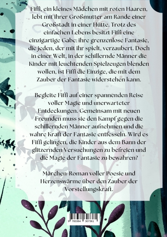 Fiffi, ein kleines Mädchen mit roten Haaren, lebt mit ihrer Großmutter am Rande einer Großstadt in einer Hütte. Trotz des einfachen Lebens besitzt Fiffi eine einzigartige Gabe: ihre grenzenlose Fantasie, die jeden, der mit ihr spielt, verzaubert. Doch in einer Welt, in der schillernde Männer die Kinder mit leuchtenden Spielzeugen blenden wollen, ist Fiffi die Einzige, die dem Zauber der Fantasie widerstehen kann.Begleite Fiffi auf einer spannenden Reise voller Magie und unerwarteter Entdeckungen. Gemeinsam mit neuen Freunden muss sie den Kampf gegen die schillernden Männer aufnehmen und die wahre Kraft der Fantasie entfesseln. Wird es Fiffi gelingen, die Kinder aus dem Bann der glitzernden Versuchungen zu befreien und die Magie der Fantasie zu bewahren?