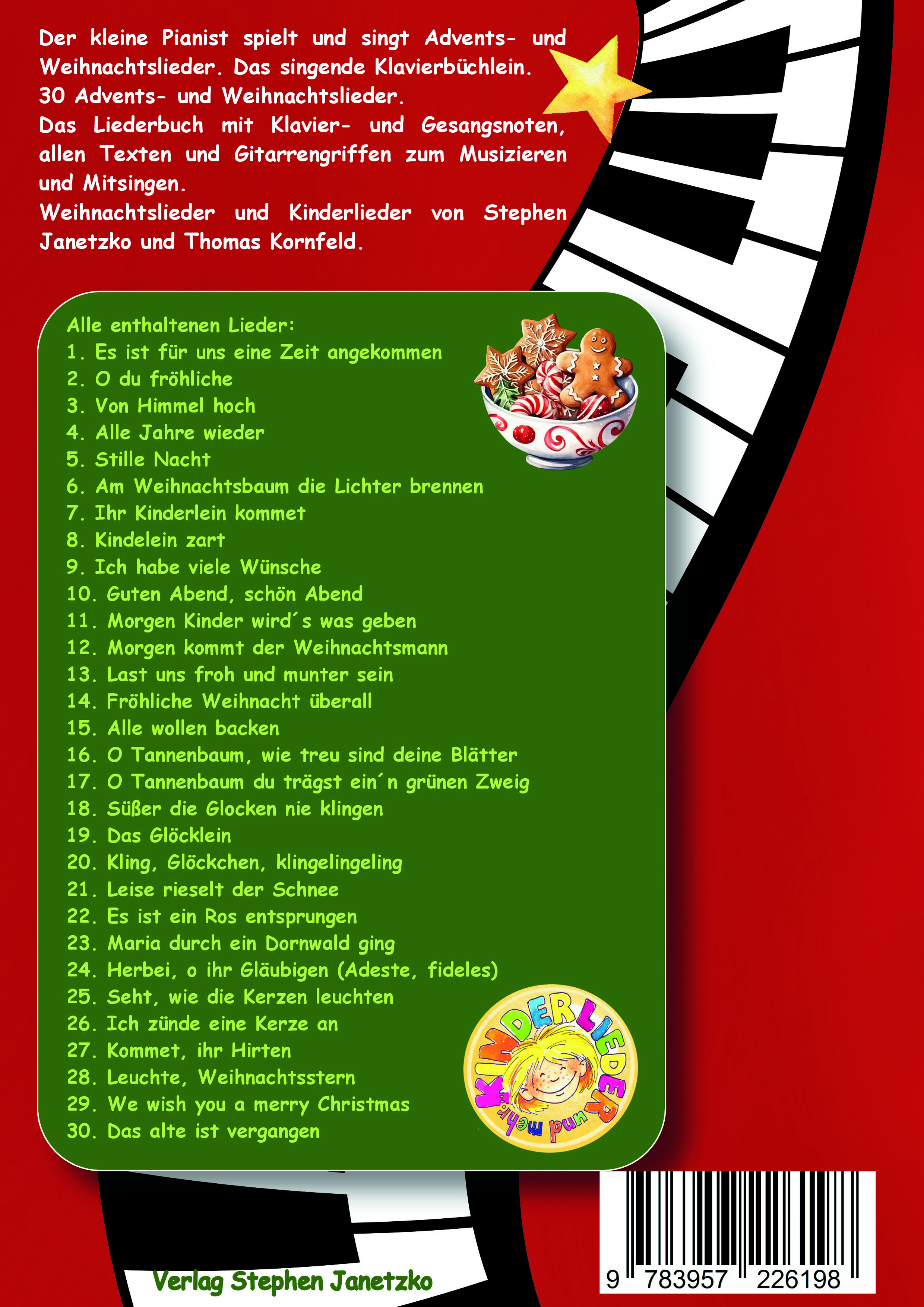 Der kleine Pianist spielt und singt Advents- und Weihnachtslieder.Das singende Klavierbüchlein. 30 Advents- und Weihnachtslieder.Das Liederbuch mit Klavier- und Gesangsnoten, allen Texten und Gitarrengriffen zum Musizieren und Mitsingen.Weihnachtslieder und Kinderlieder von Stephen Janetzko und Thomas Kornfeld."Gibt es eventuell auch von all den vielen schönen Liedern des Verlages kurze und leichte Klavierstücke für Anfänger?"Wir freuen uns, diese Frage nun mit "Ja!" zu beantworten und können hier zu vielen Liedern leichte bis mittelschwere Klaviersätze anbieten. Wir wollen sogar noch einen Schritt weitergehen. Warum nur Klavier spielen und nicht auch noch dazu singen? Beides gemeinsam stellt hohe Ansprüche an die Musikalität der Kinder und ist eine anspruchsvolle künstlerische Aufgabe.Zum Thema Advents- und Weihnachtszeit stellen wir nun 30 Lieder mit den üblichen Vokalnoten, Text und Gitarrenharmonien den Klaviersatz mit einer Gesangstimme gegenüber. Der Klaviersatz gibt die Melodie des Liedes detailgetreu wieder. So kann jeder selbst entscheiden welche Fassung des Liedes musiziert werden soll, egal ob als eigenständiger Klaviervortrag oder als Klavierbegleitung zum Klassengesang in der Schule, für die Chorarbeit oder den Sologesang. Darüber hinaus stellen wir alle Klaviersätze von Thomas Kornfeld instrumental zur Demonstration, zum Mitspielen, Üben und Anhören als Audios zum Download bereit (separat über alle gängigen Download- und Streaming-Plattformen, wo auch die meisten Lieder in gesungener Form vorliegen).Viel Freude und Erfolg beim Klavierspielen und Singen wünschen die Autoren.PS. Weitere Ausgaben in selber Aufmachung sind in dieser Reihe zu weiteren Themen erhältlich und in Vorbereitung.Alle enthaltenen Lieder:1. Es ist für uns eine Zeit angekommen2. O du fröhliche3. Von Himmel hoch4. Alle Jahre wieder5. Stille Nacht6. Am Weihnachtsbaum die Lichter brennen7. Ihr Kinderlein kommet8. Kindelein zart9. Ich habe viele Wünsche10. Guten Abend, schön Abend11. Morgen Kinder wird´s was geben12. Morgen kommt der Weihnachtsmann13. Last uns froh und munter sein14. Fröhliche Weihnacht überall15. Alle wollen backen16. O Tannenbaum, wie treu sind deine Blätter17. O Tannenbaum du trägst ein´n grünen Zweig18. Süßer die Glocken nie klingen19. Das Glöcklein20. Kling, Glöckchen, klingelingeling21. Leise rieselt der Schnee22. Es ist ein Ros entsprungen23. Maria durch ein Dornwald ging24. Herbei, o ihr Gläubigen (Adeste, fideles)25. Seht, wie die Kerzen leuchten26. Ich zünde eine Kerze an27. Kommet, ihr Hirten28. Leuchte, Weihnachtsstern29. We wish you a merry Christmas30. Das alte ist vergangen