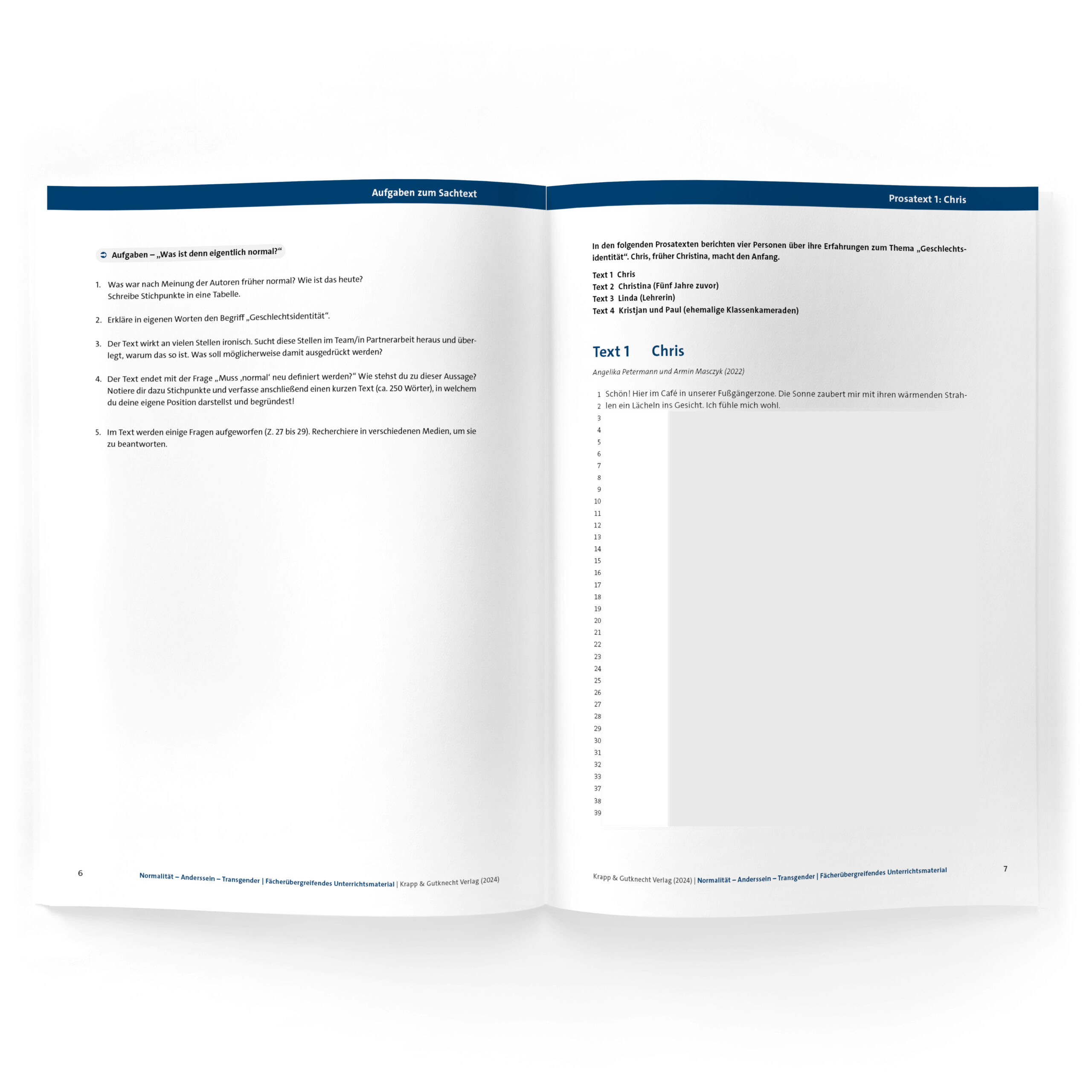 | Schlagworte | Anderssein • Arbeitsblätter • Aufgaben • Geschlechtsumwandlung • Identität • Inklusion • Integration • LGBT • lgbtqi+ • Lösungen • Mobbing • Normalität • Prosatexte • Sachtexte • Schule • Texte |