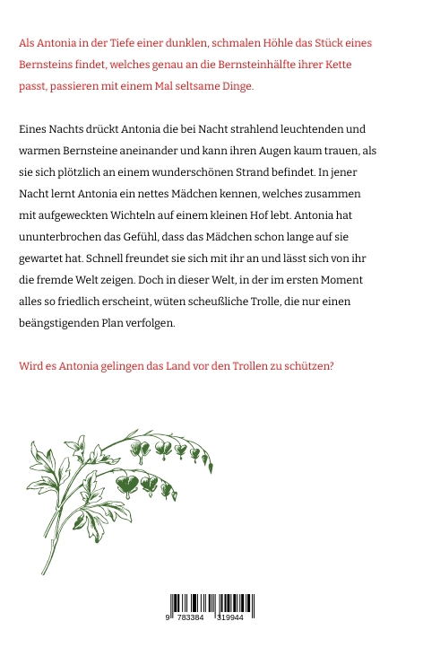 Eines Nachts drückt Antonia, die bei Nacht strahlend leuchtenden und warmen Bernsteine aneinander und kann ihren Augen kaum trauen, als sie sich plötzlich an einem wunderschönen Ort befindet. In jener Nacht lernt Antonia ein nettes Mädchen kennen, welches zusammen mit aufgeweckten Wichteln auf einem kleinen Hof lebt. Antonia hat ununterbrochen das Gefühl, dass das Mädchen schon lange auf sie gewartet hat. Schnell freundet sie sich mit ihr an und lässt sich von ihr die fremde Welt zeigen. Doch in dieser Welt, in der im ersten Moment, alles so friedlich erscheint, wüten scheußliche Trolle, die nur einen beängstigenden Plan verfolgen.