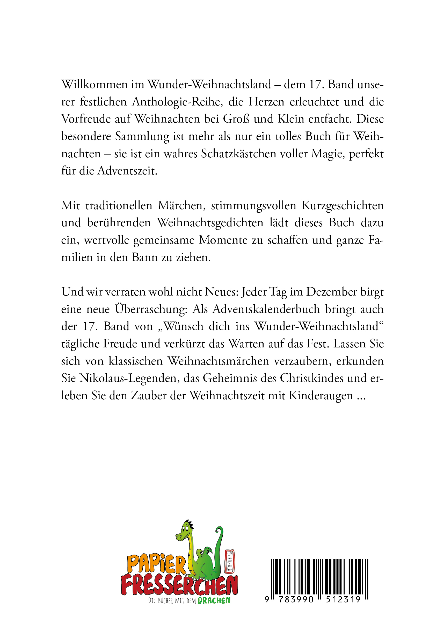 Und wir verraten wohl nichts Neues: Jeder Tag im Dezember birgt eine neue Überraschung: Als Adventskalenderbuch bringt auch der 17. Band von „Wünsch dich ins Wunder-Weihnachtsland“ tägliche Freude und verkürzt das Warten auf das Fest. Lassen Sie sich von klassischen Weihnachtsmärchen verzaubern, erkunden Sie Nikolaus-Legenden, das Geheimnis des Christkinds und erleben Sie den Zauber der Weihnachtszeit mit Kinderaugen ...